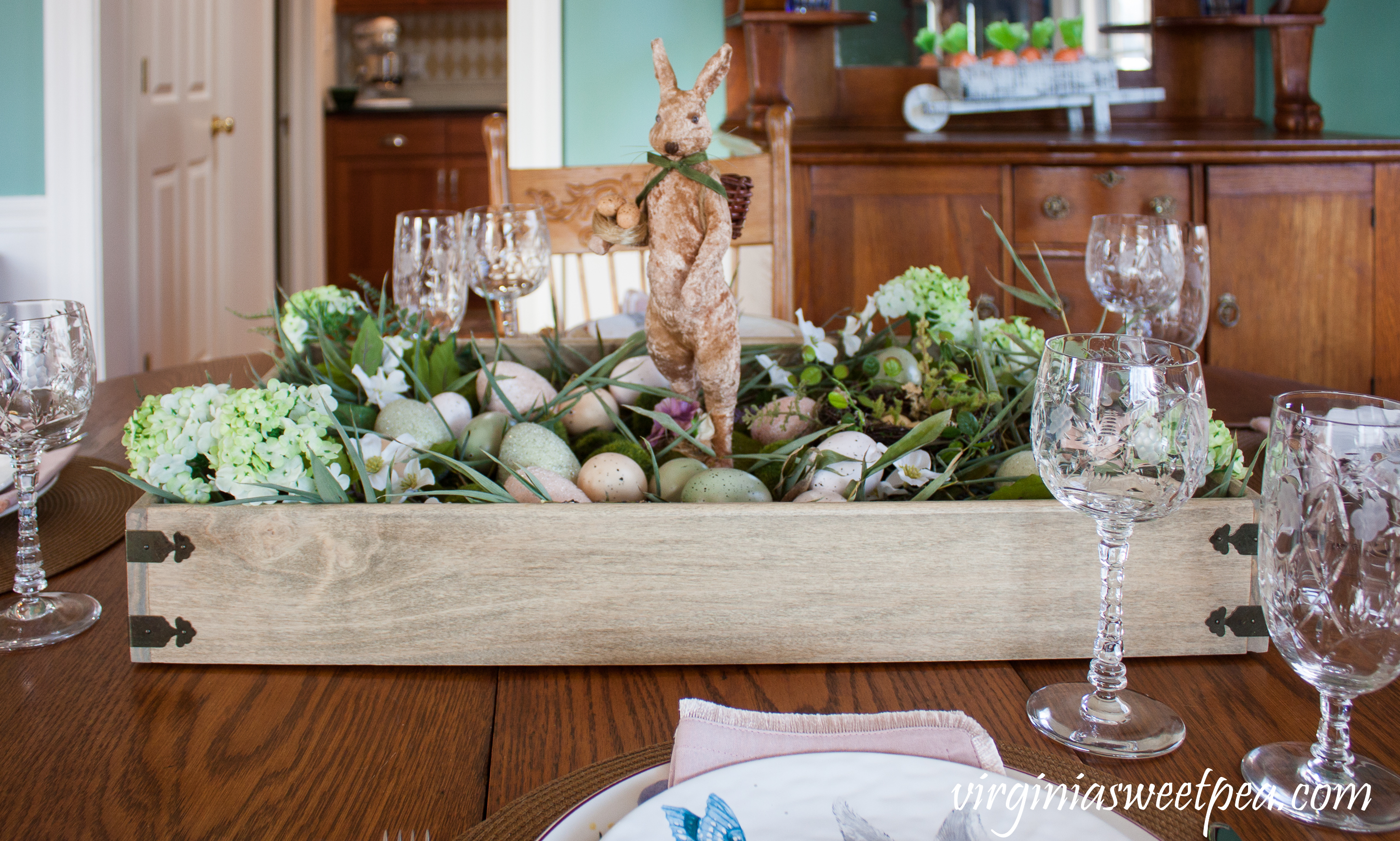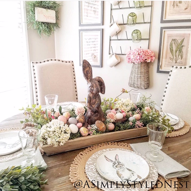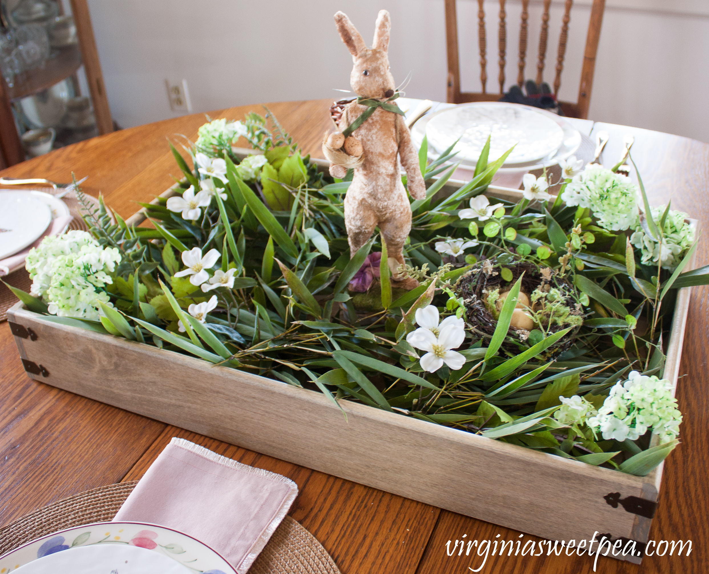 Farmhouse Style Easter Centerpiece - Learn how to make this centerpiece and get ideas for your Easter table. #easter #eastercenterpiece #rabbit #easterbunny #farmhouse #farmhousecenterpiece #eastertable