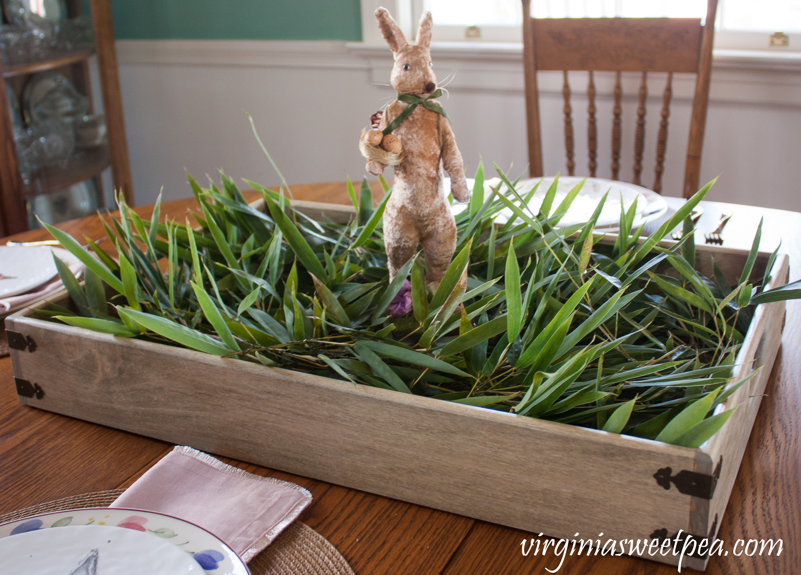As I made the centerpiece, I took pictures of the stages so that you can copy this look for your home.  I started with the tray and rabbit.  I made the tray a few years ago and it usually is used at our lake house on the coffee table for holding magazines and coasters.  If we had a tv there, it also would hold remotes.  I bought the rabbit long ago at a local home decor shop that is no longer in business.