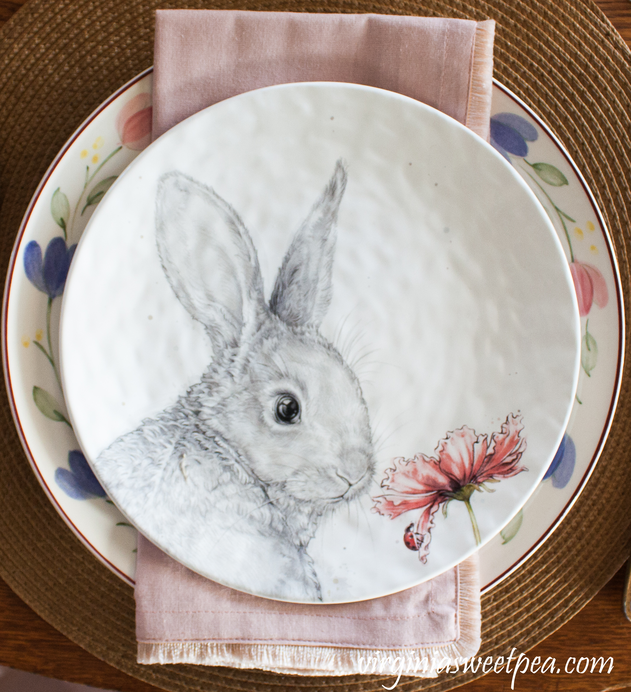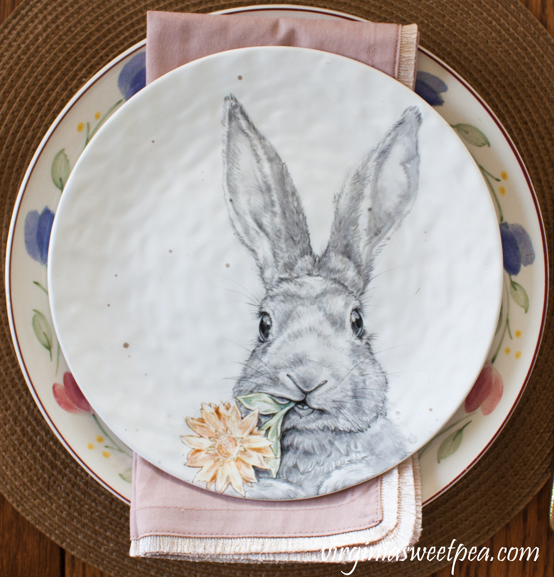 I used pink napkins that I found on sale at Pier1 to coordinate with both the bunny plate florals and the floral design on the edge of my plates.