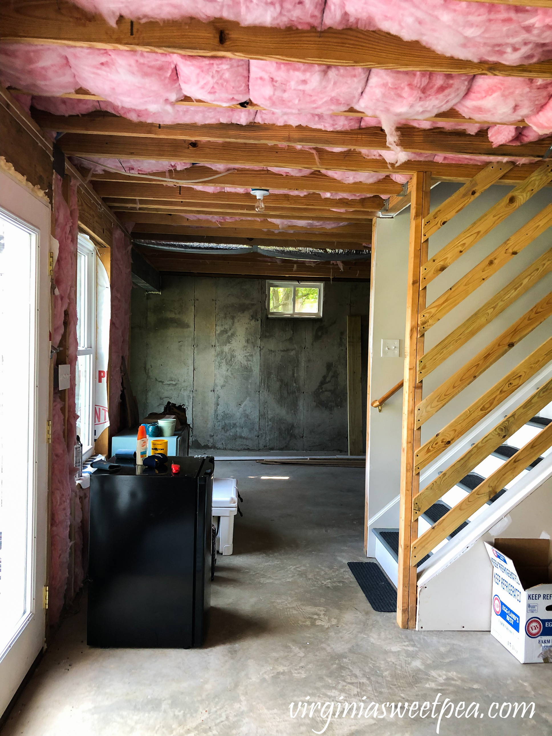 The room to the right of the staircase will also be finished. A wall with a doorway will be constructed just past the white cooler that you see in the picture below.