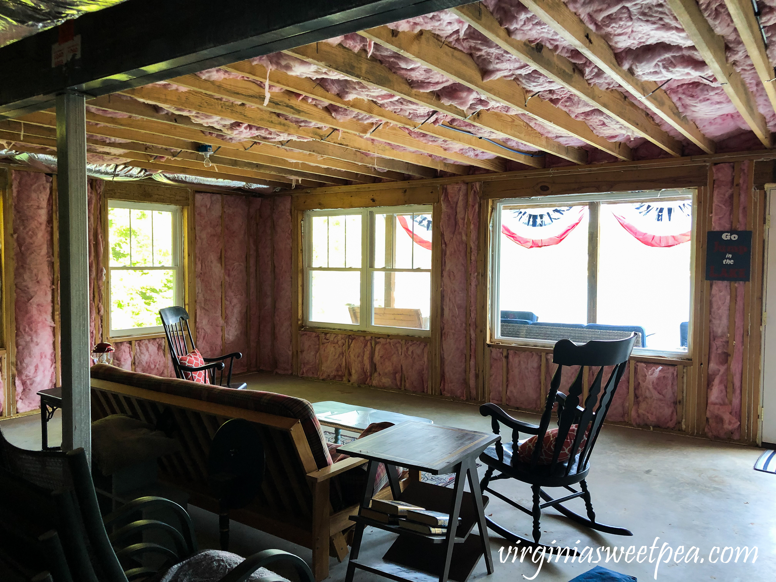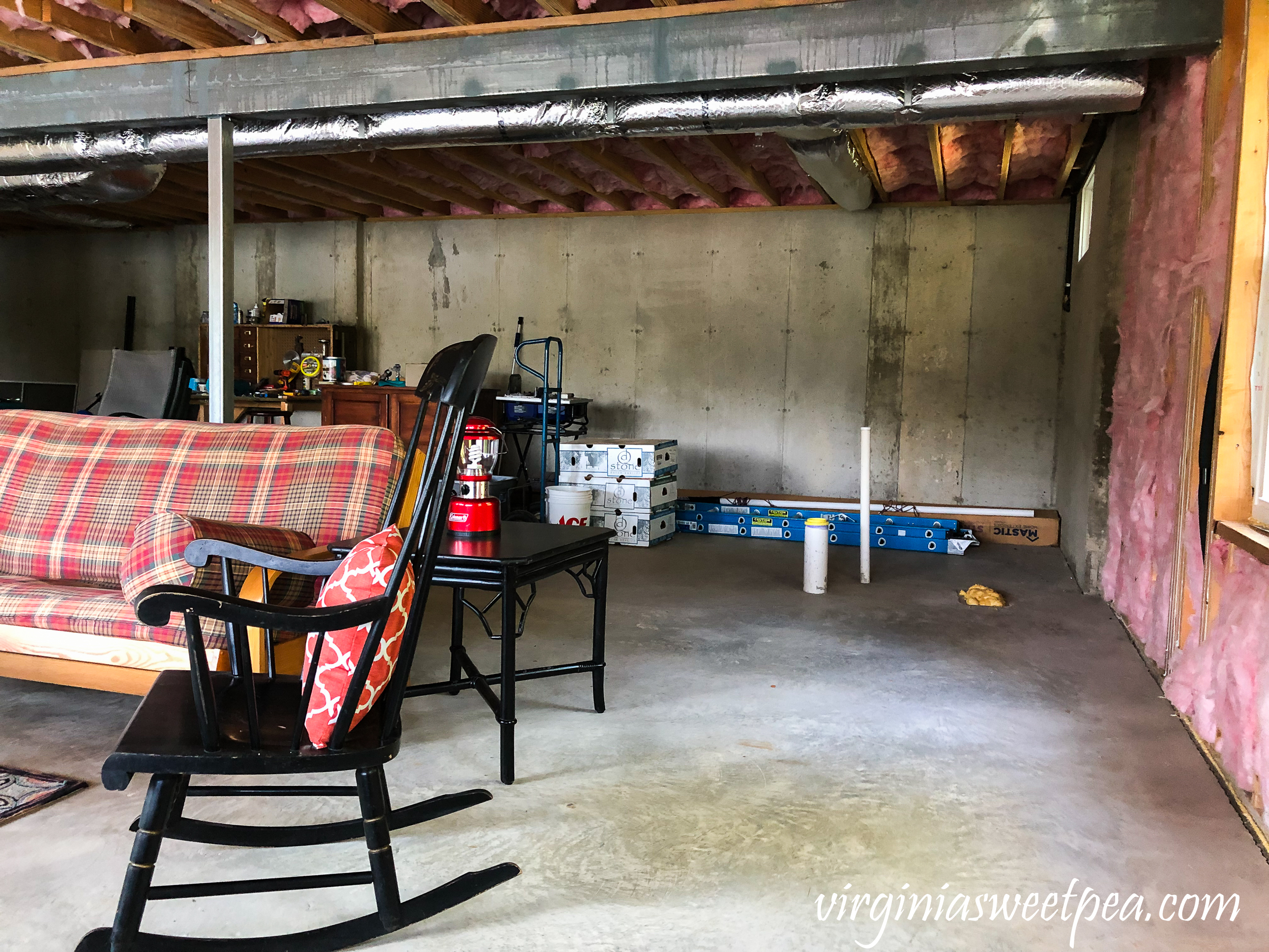 When we built the house, we set up a sitting area in the future family room with odds and ends of furniture but we rarely use it. Who wants to sit in an unfinished basement? Not me. The sofa mainly was used as a place to pile our outdoor cushions when we left after each weekend.