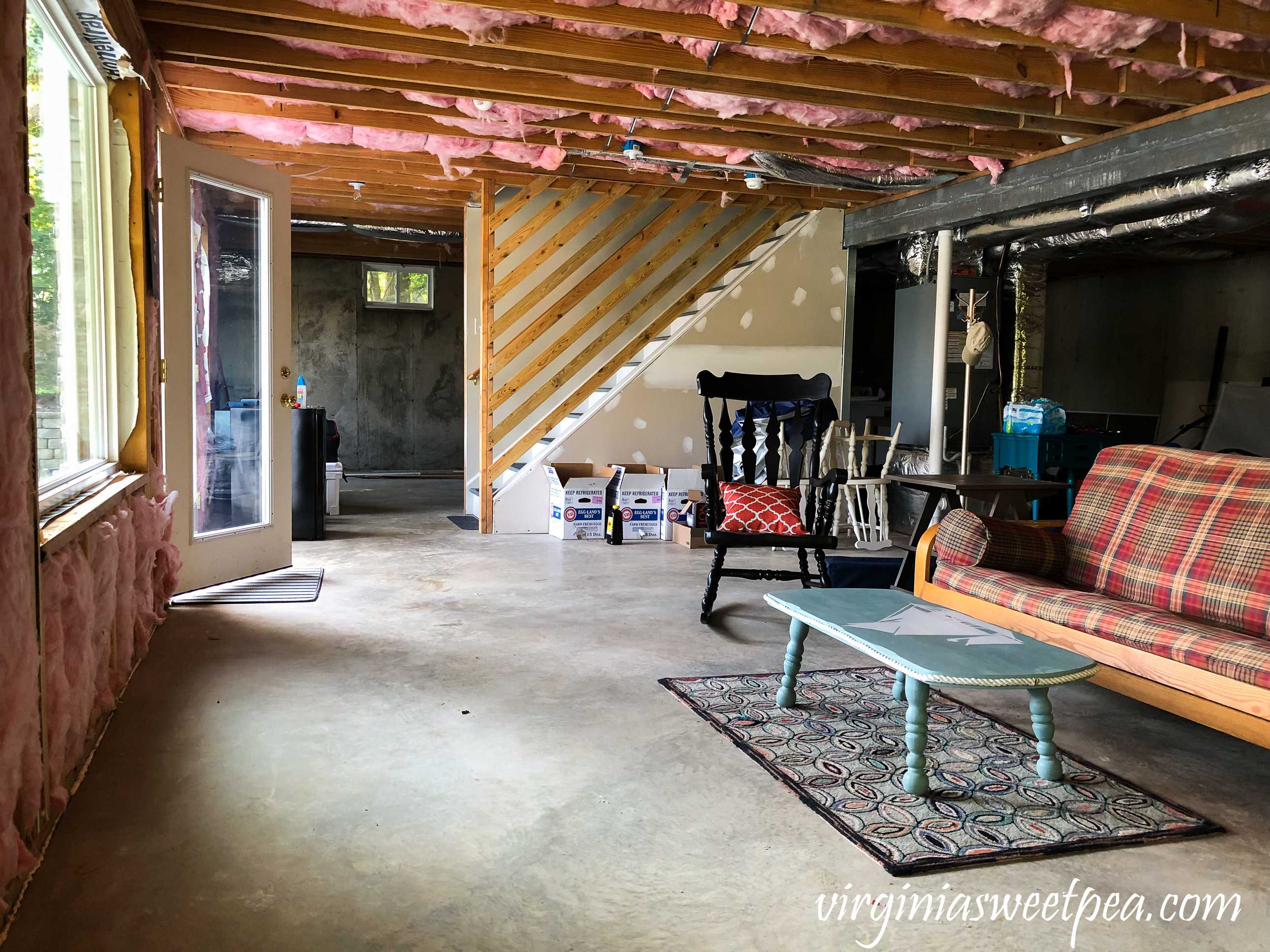 Our lake house basement is currently unfinished. The basement at this time is used for laundry, storing tools, and is pretty much just a passageway to get to the lake.