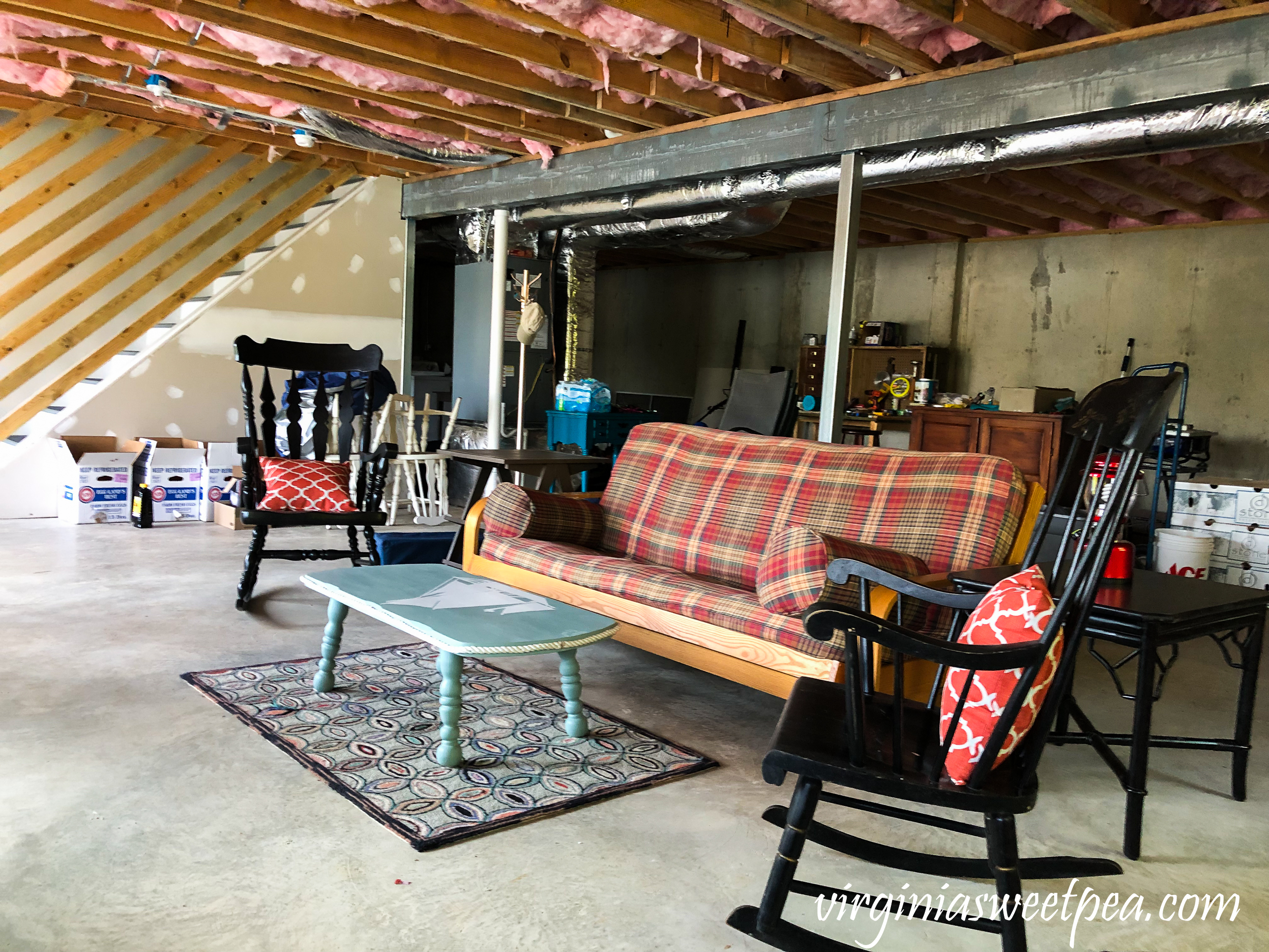 Three of the pieces of furniture in this picture are past blog projects: Plow and Hearth Knockoff Chevron End Table; Nautical Themed Coffee Table Makeover; and Rocking Chair Makeover. Also stored in the basement is a Media Cabinet Makeover with Decoupage and a Media Console built by Mr. SP.