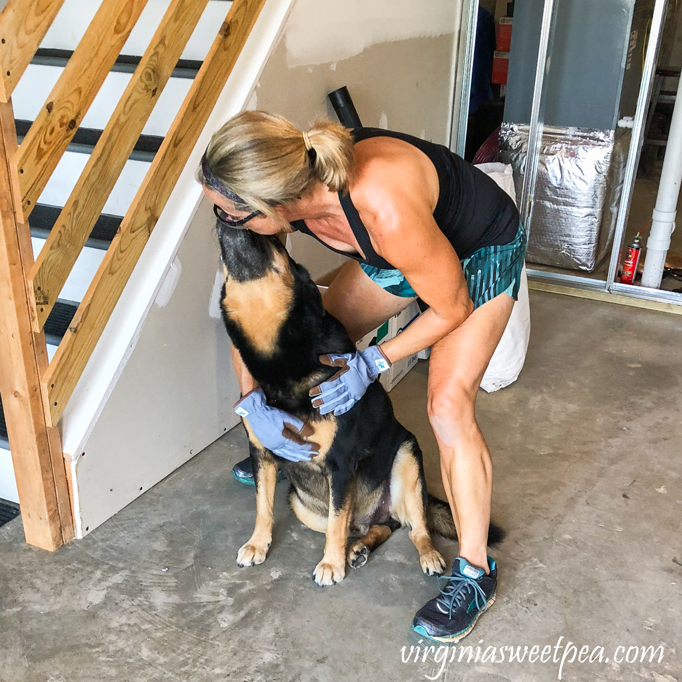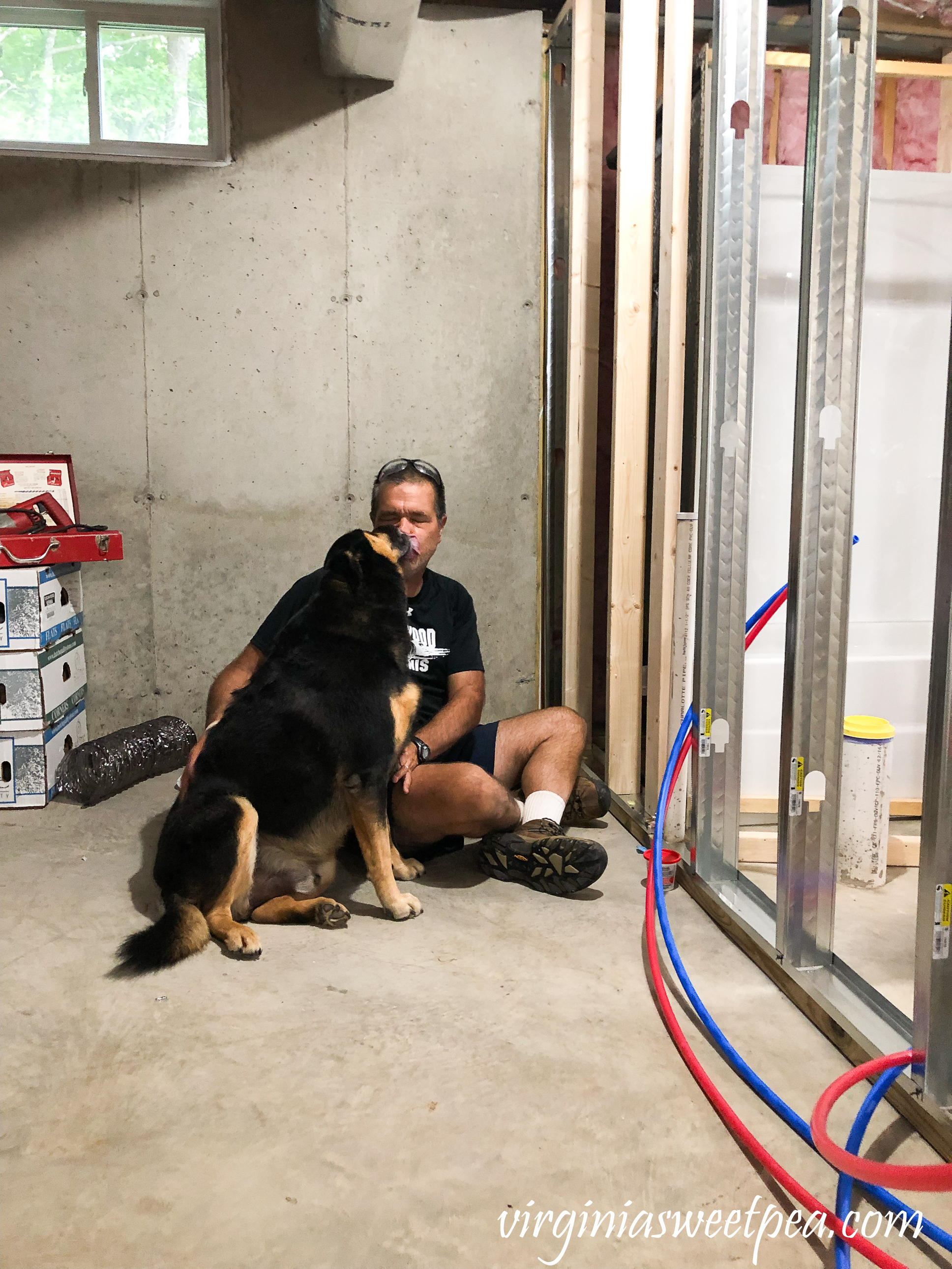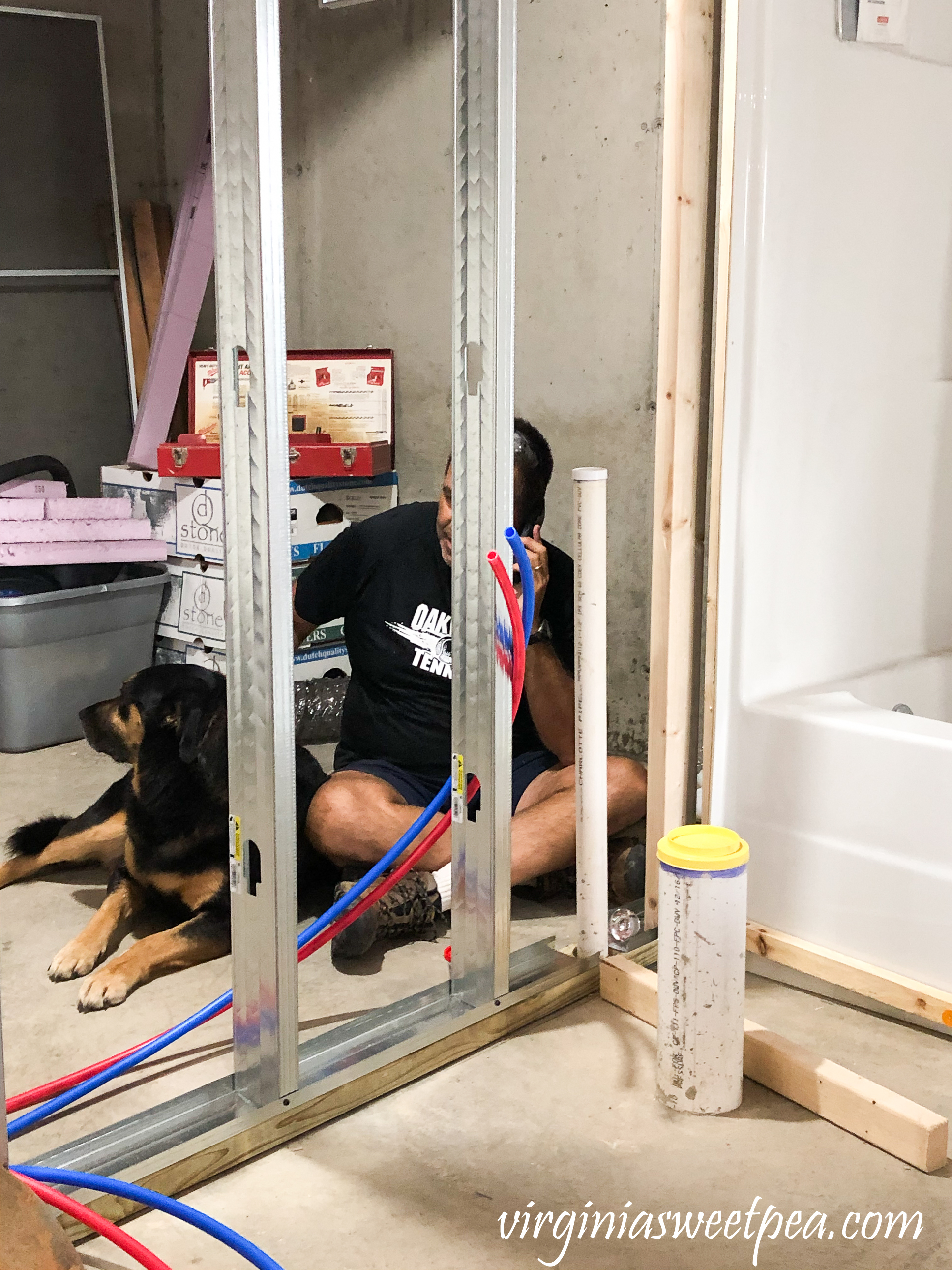 Sherman helped his daddy as he worked on the plumbing. Here Mr. SP is working on plumbing, petting Sherman, and on the phone helping to solve a problem at work. All the plumbing was easy as PEX was used throughout the house, and we used it for the new bathroom space too. PEX is really easy to use.