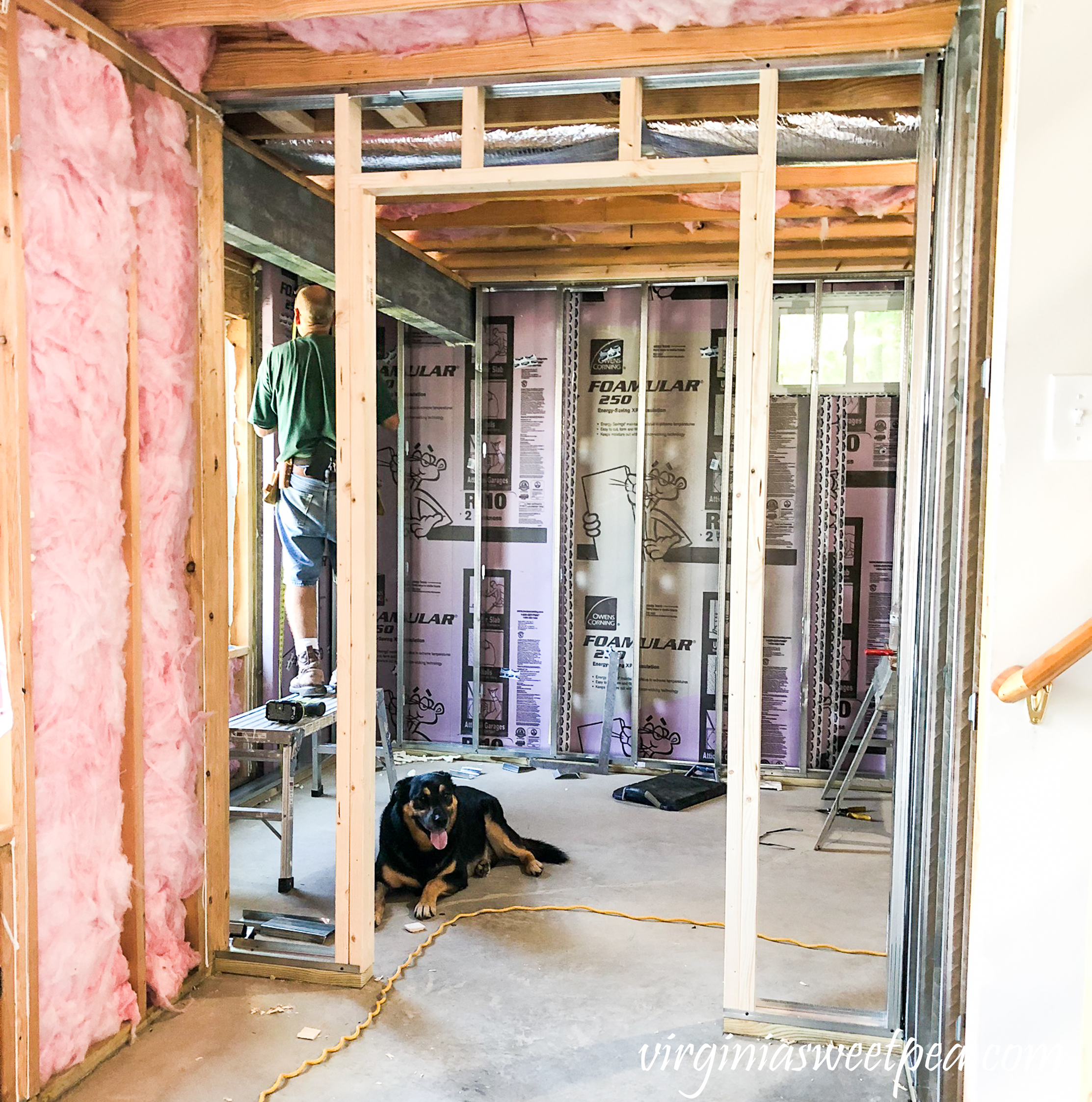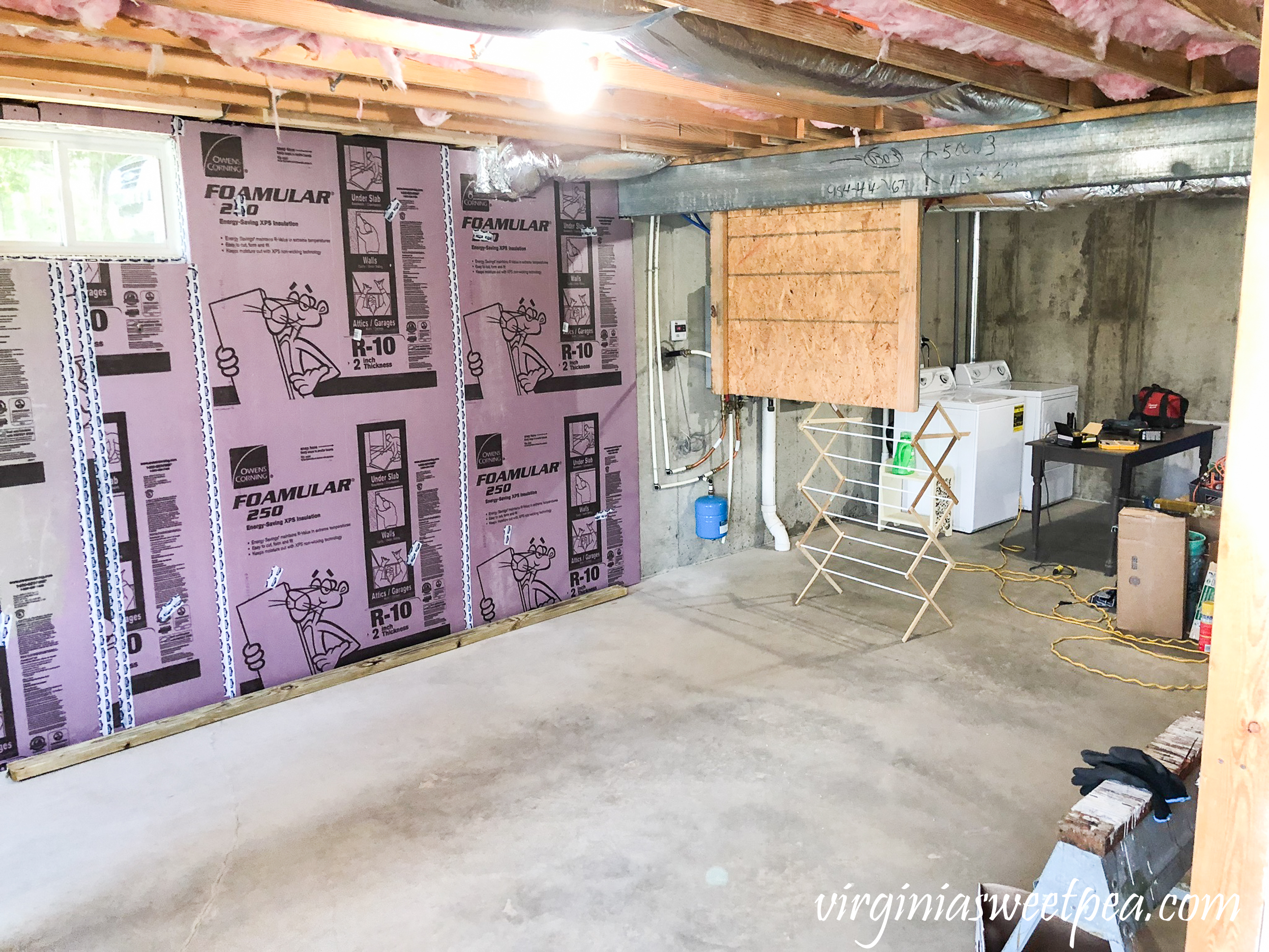 After the floor was marked for the studs, the guys added insulation to the concrete wall in the extra room.