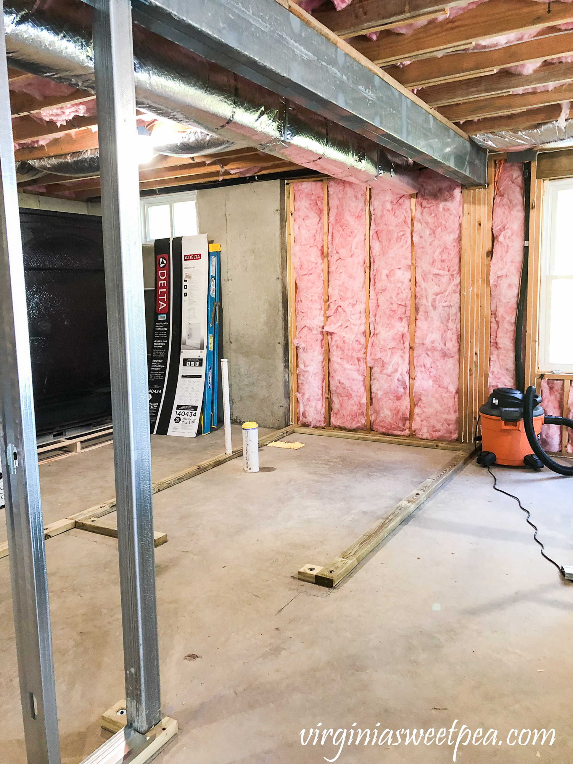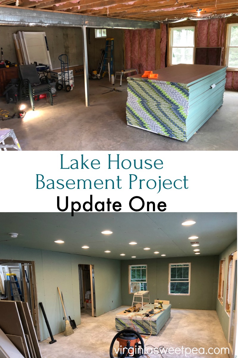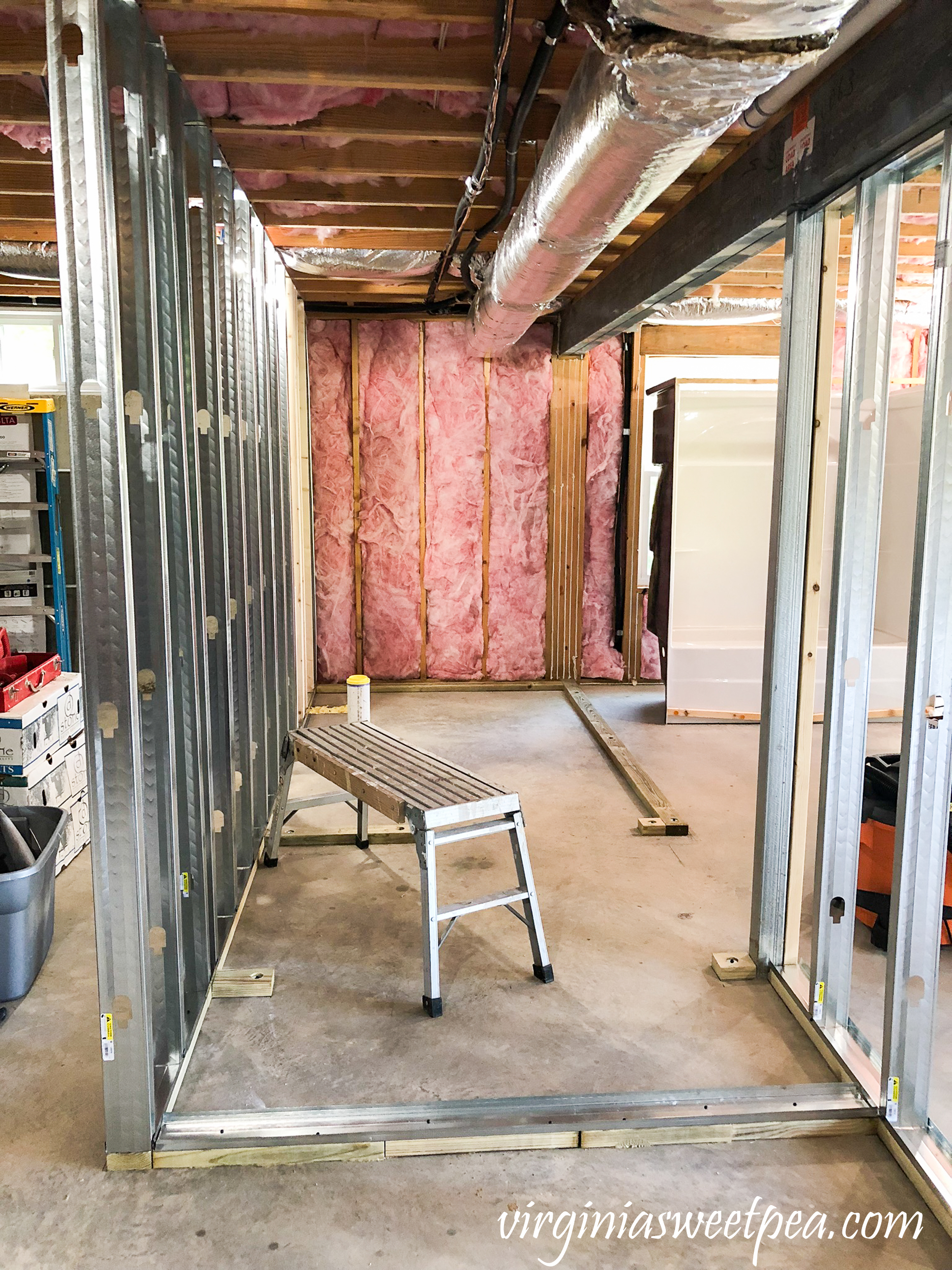 If you missed our basement project plans, we are adding a family room, bathroom, linen closet, and extra room to our unfinished lake house basement.
