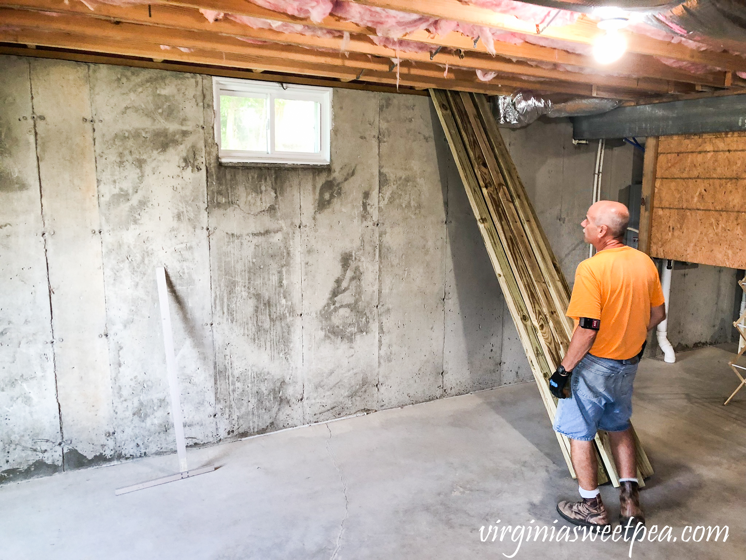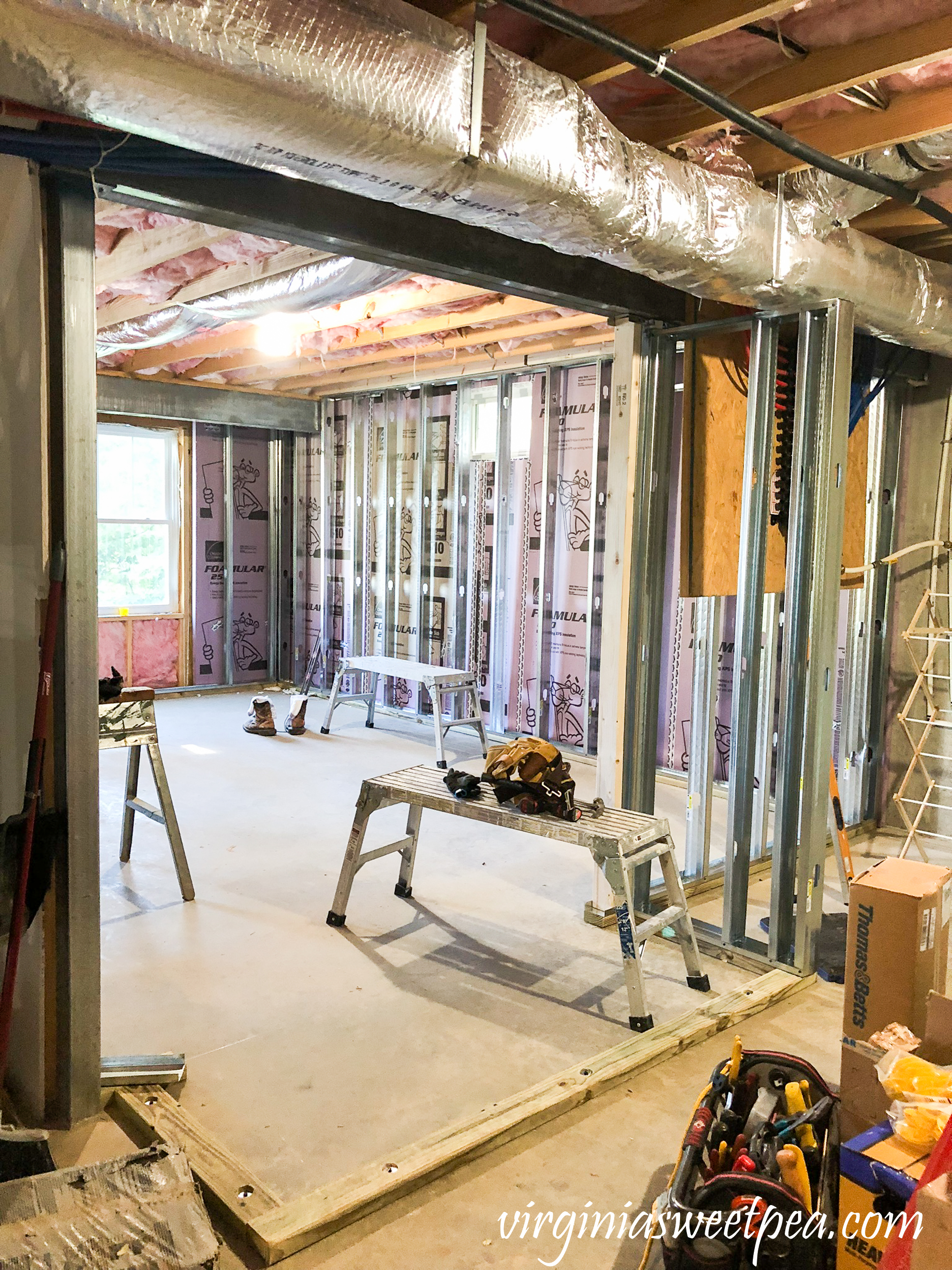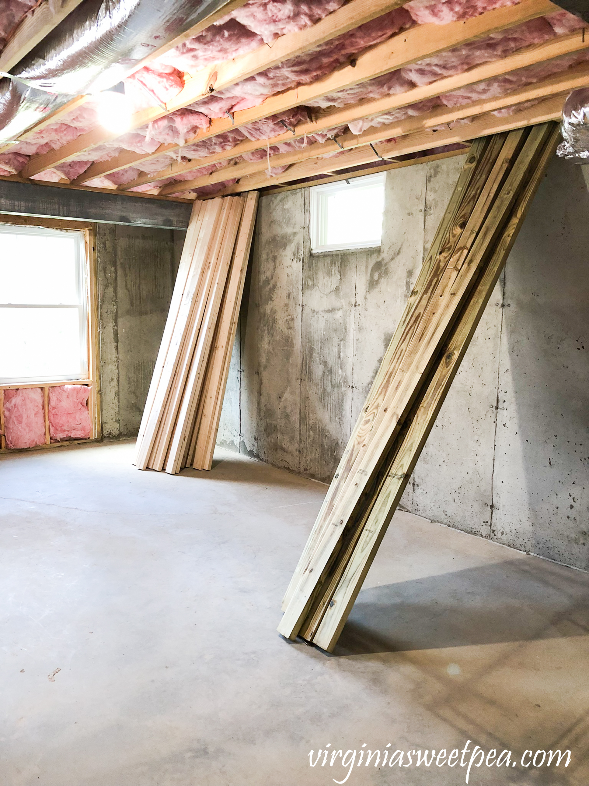 If you missed our basement project plans, we are adding a family room, bathroom, linen closet, and extra room to our unfinished lake house basement.