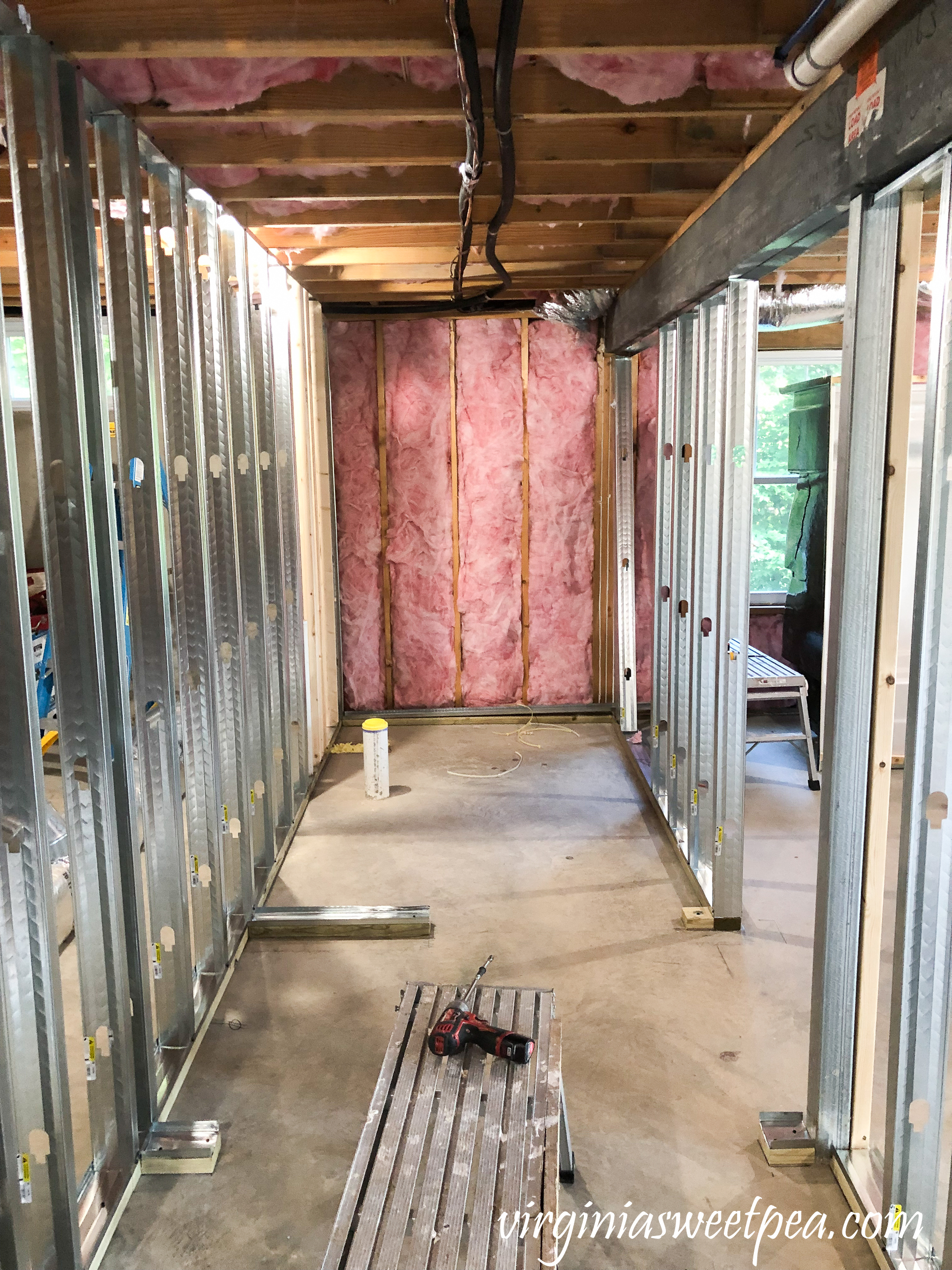 We ran out of metal studs (from Home Depot) and the local Lowe’s (25 min. from out lake house) didn’t carry them, so rather than drive an hour each way to buy more metal studs from Home Depot, Mr. SP finished framing this section with 2×4’s.