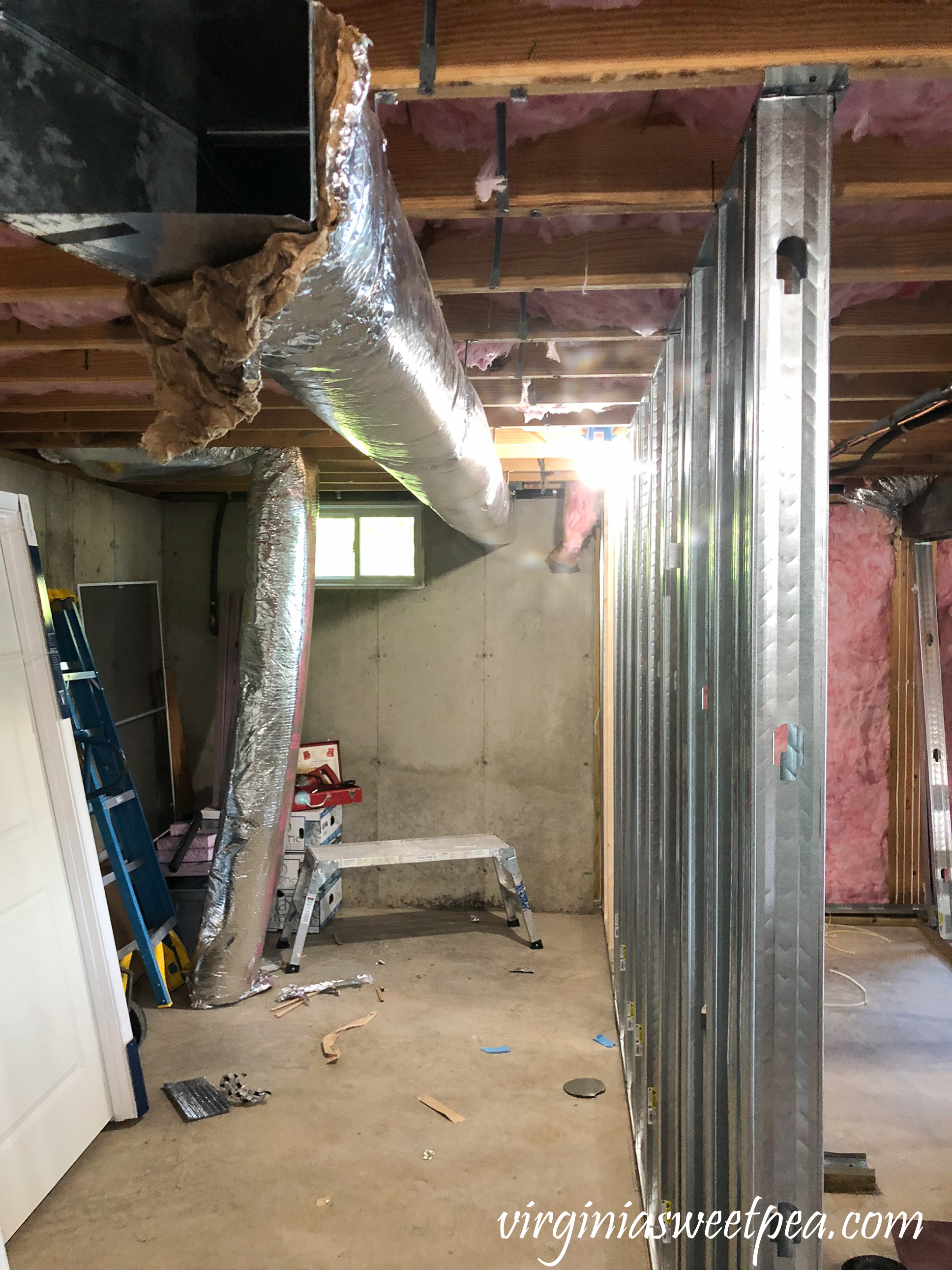 The HVAC was a lot of work. This duct had to be moved out of the bathroom/hall/closet area to the left in the unfinished part of the basement.