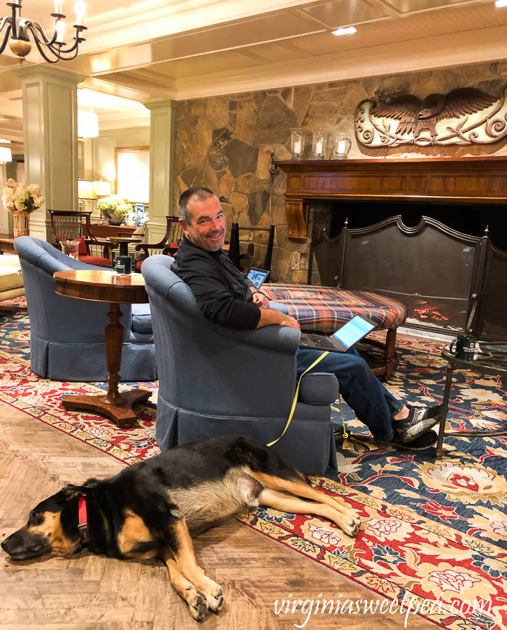 Morning or evening, Sherman enjoyed the lobby of the Woodstock Inn along with us.