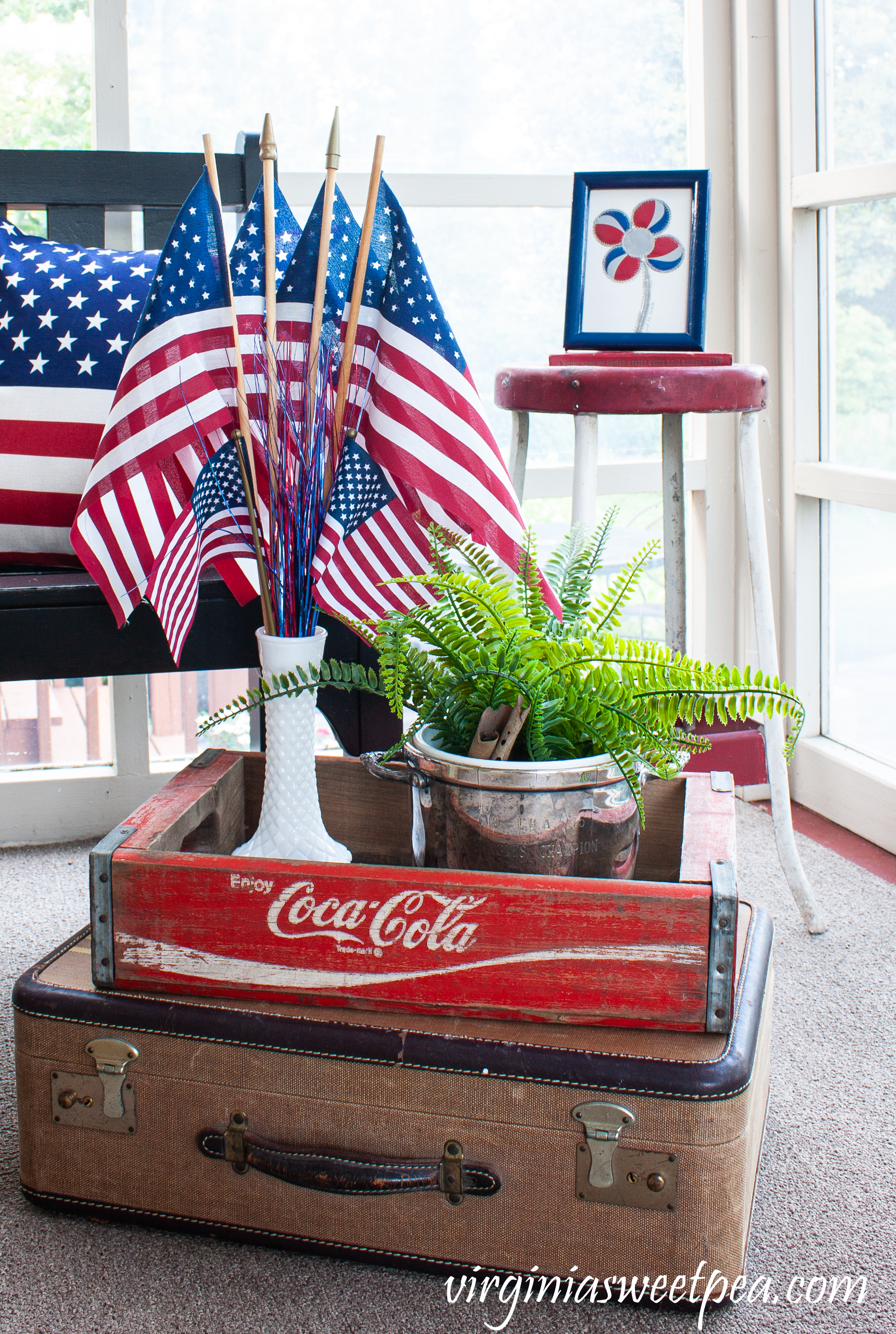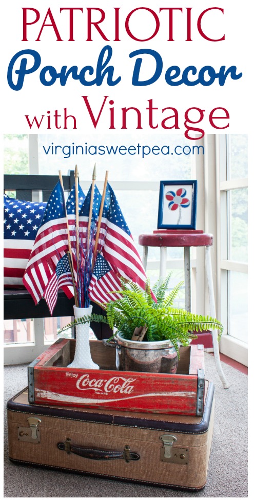 I always love seeing how you incorporate vintage and you do patriotic so well! I just love your porch sitting room and I think it looks so great decked with a little red, white and blue. The little red stool is my favorite! I have collected Coca-Cola for thirty years and I think it is so perfect in patriotic vignettes.