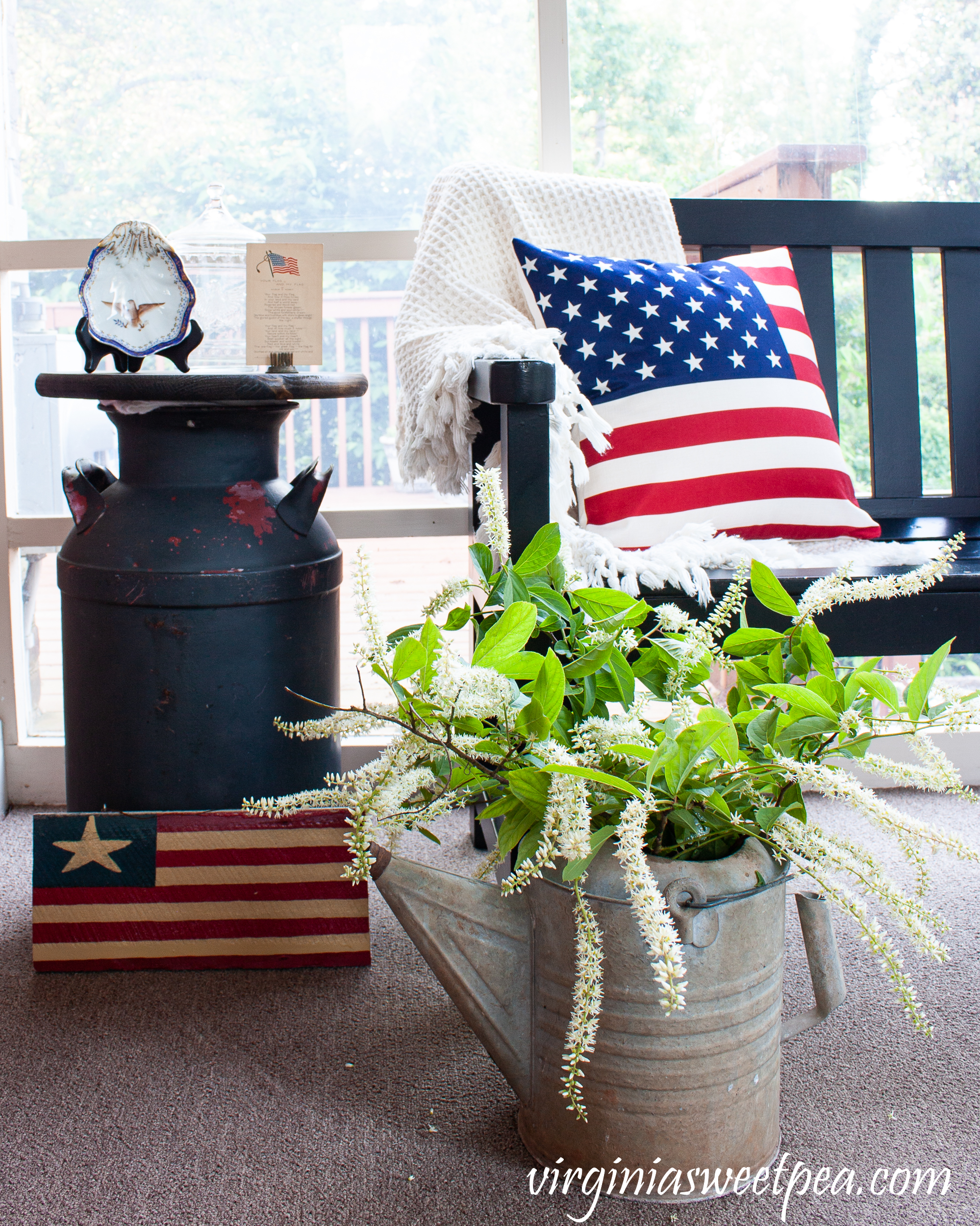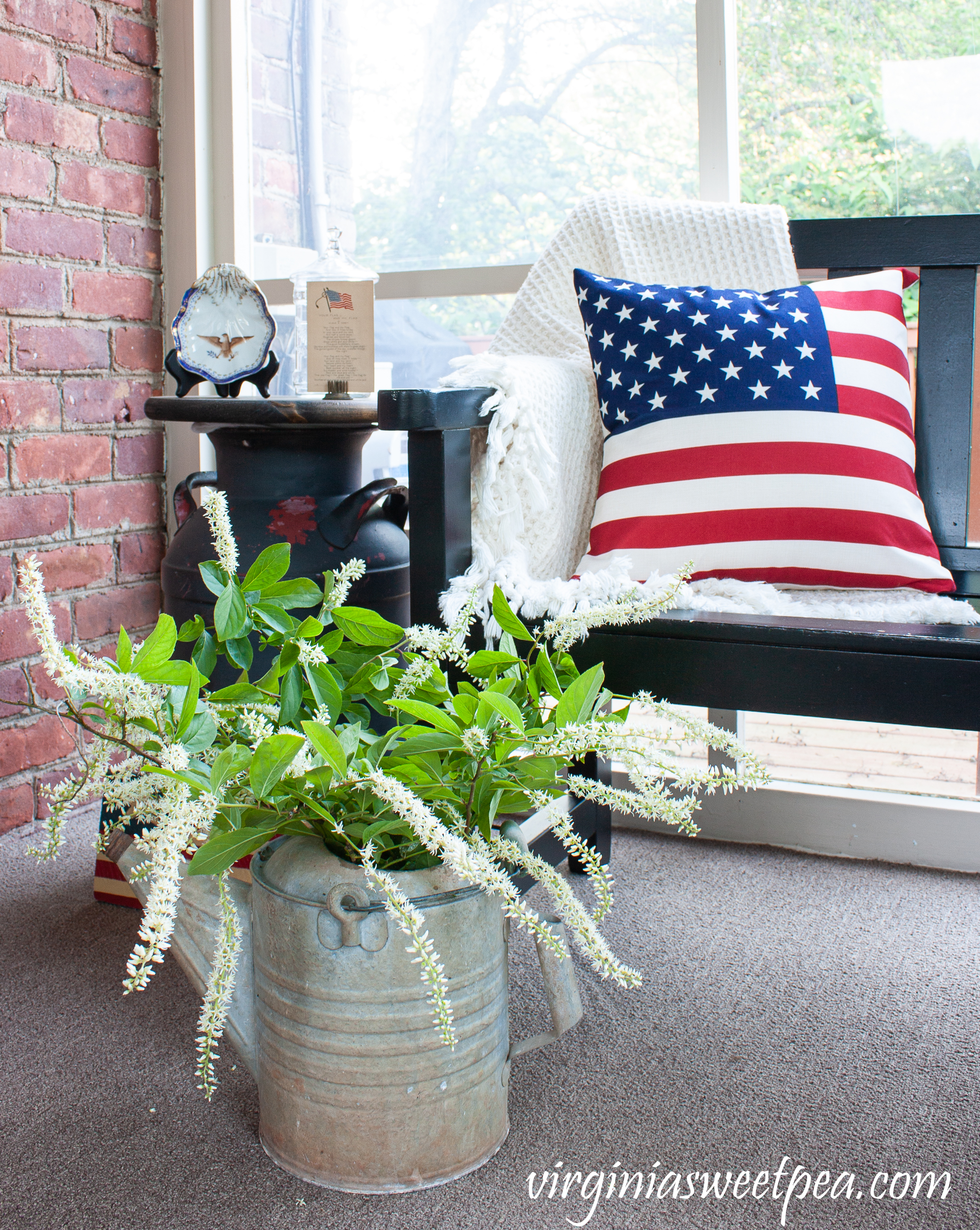 Blooming Virginia Sweetspire is displayed in a watering can that belonged to my grandparents. Since this is a patriotic display, the trailing blooms remind me of fireworks.