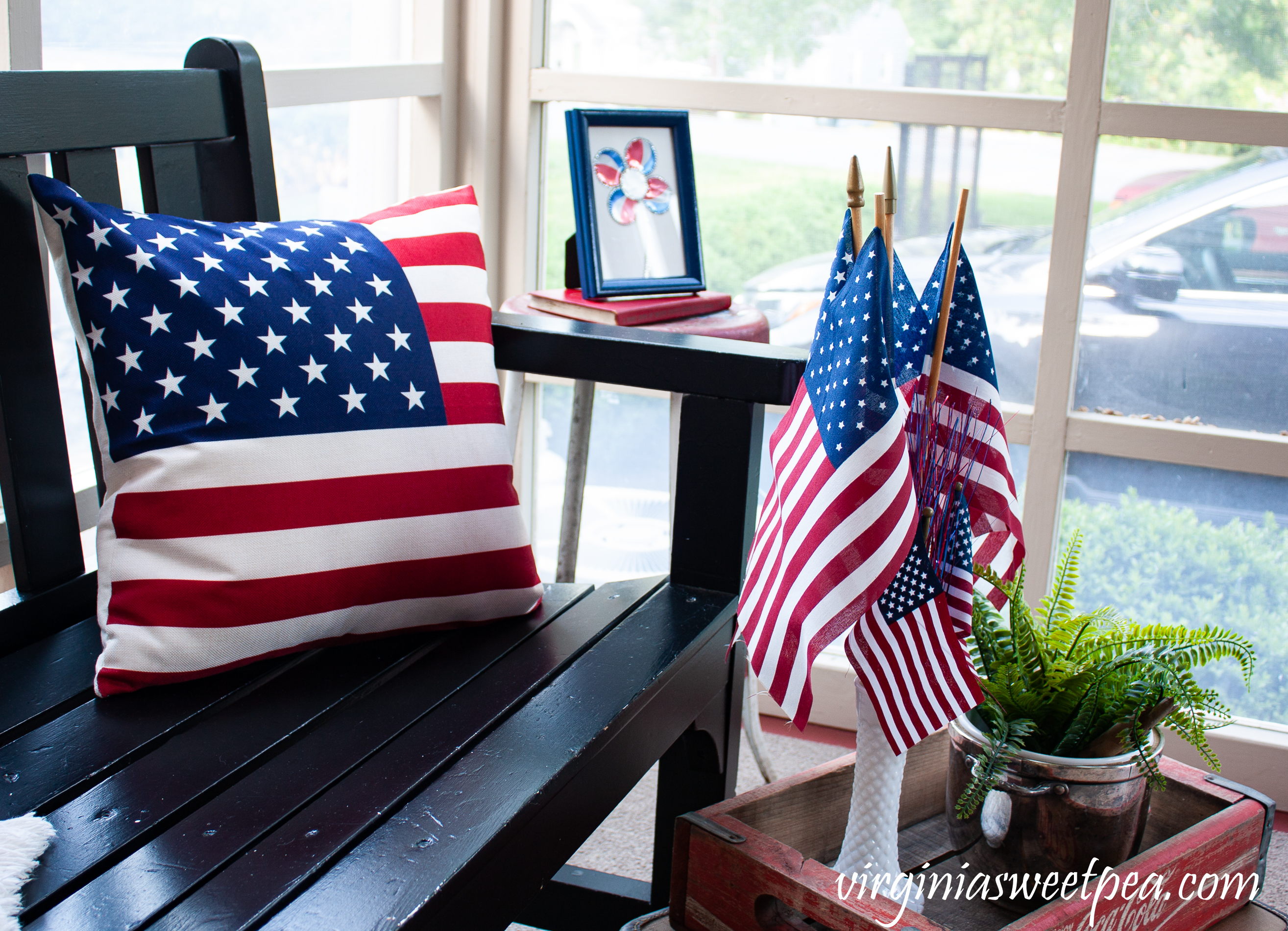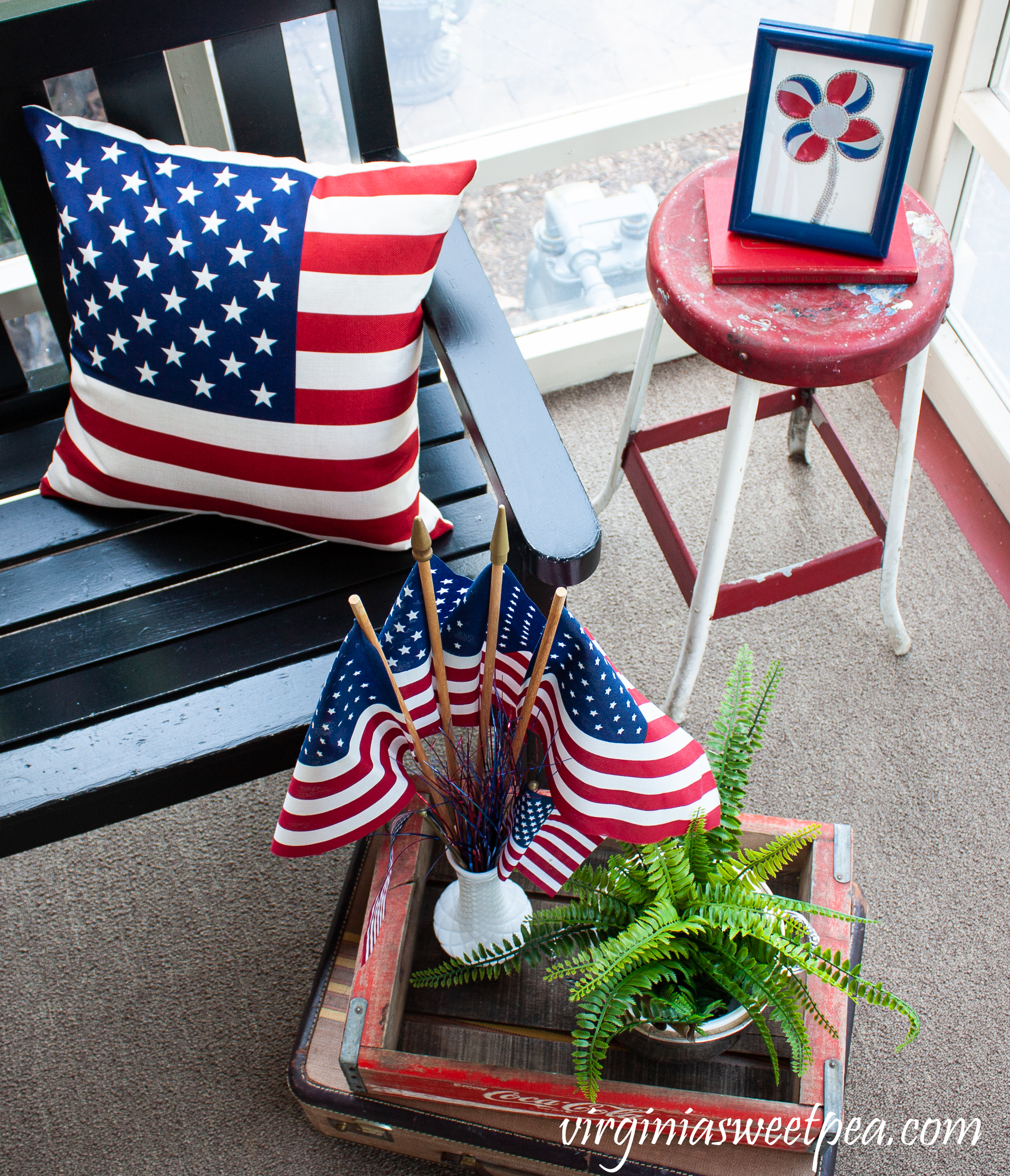 On the other side of the bench is another patriotic display featuring red, white, and blue. The suitcase was my grandmother’s, the Coke crate was an antique shop find, and the red stool was given to me by my mom.