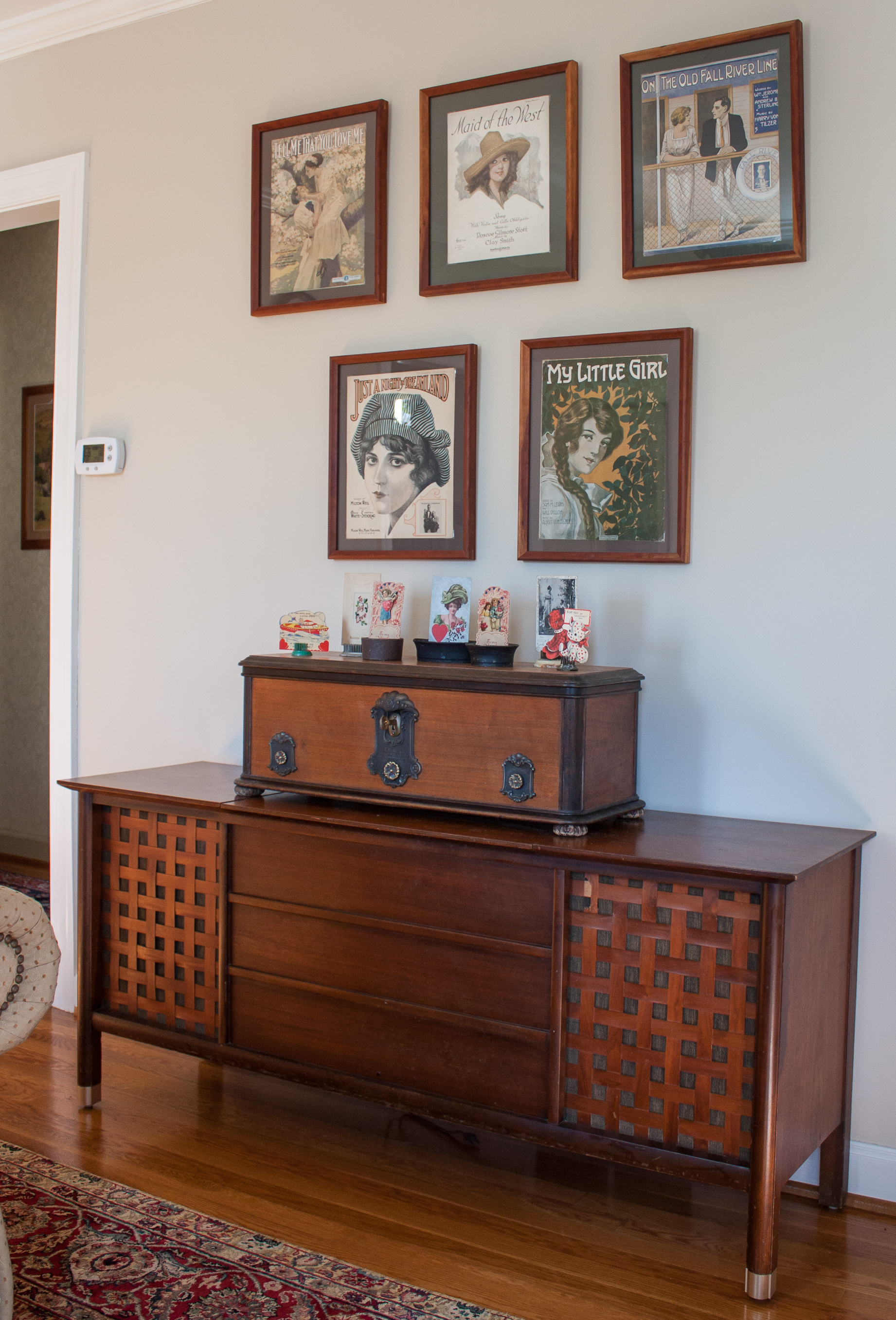 One thing that I’d love to do is to get my dad’s 1960’s stereo rewired. The turntable spins but the speakers don’t work correctly. The box on top of the stereo was made from an old radio. The sheet music hanging above it is WWI era and belonged to a cousin of my grandmother. You can see more sheet music and read more about the family connection in my Cozy Winter Family Room post.