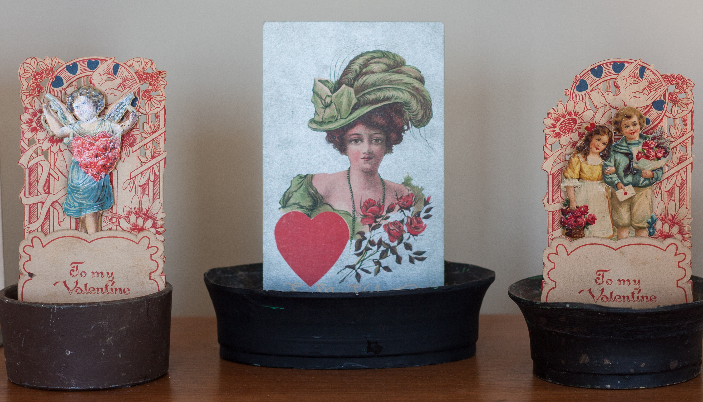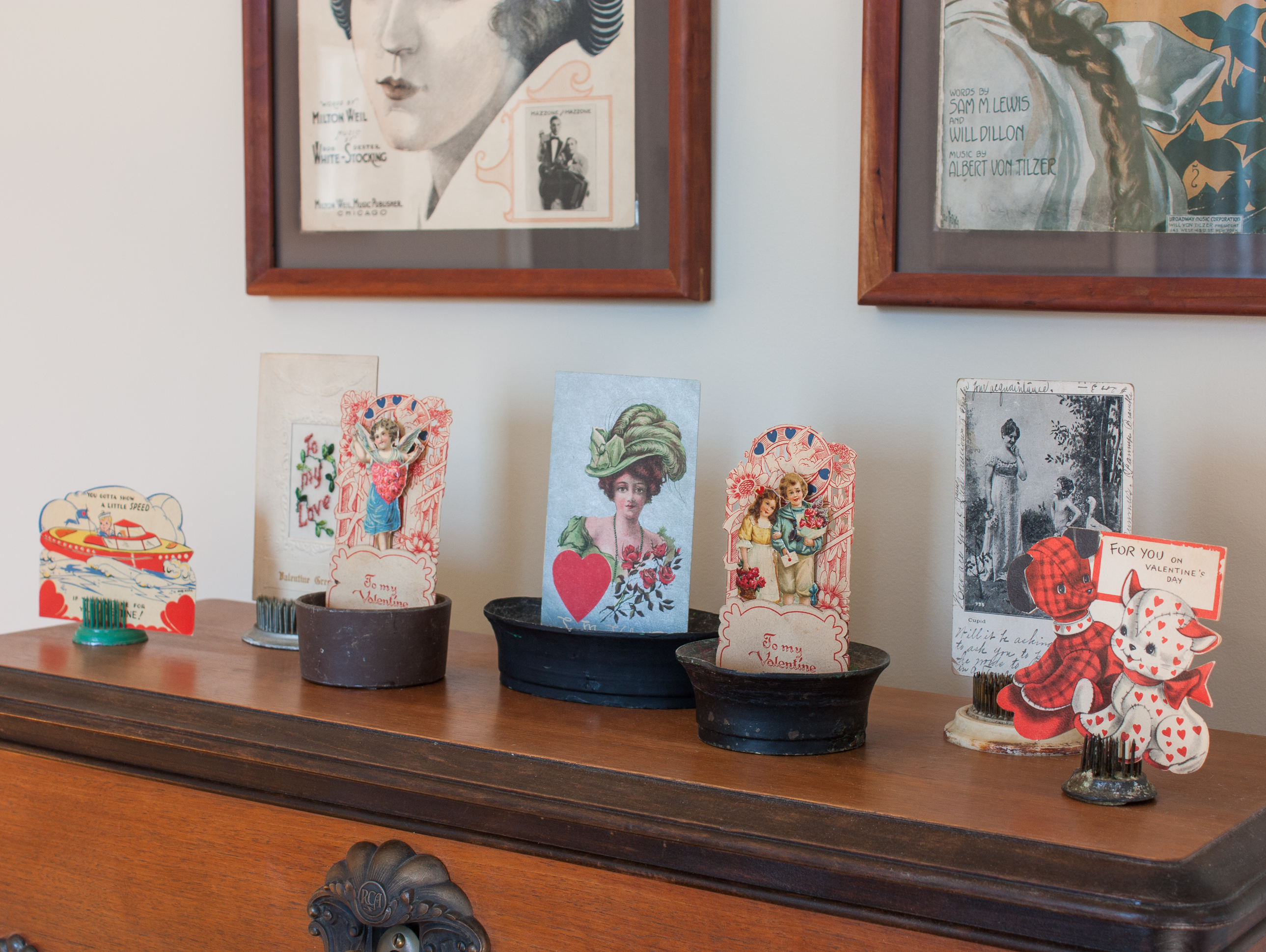 I used vintage flower frogs to display more vintage Valentine’s Day cards and postcards.