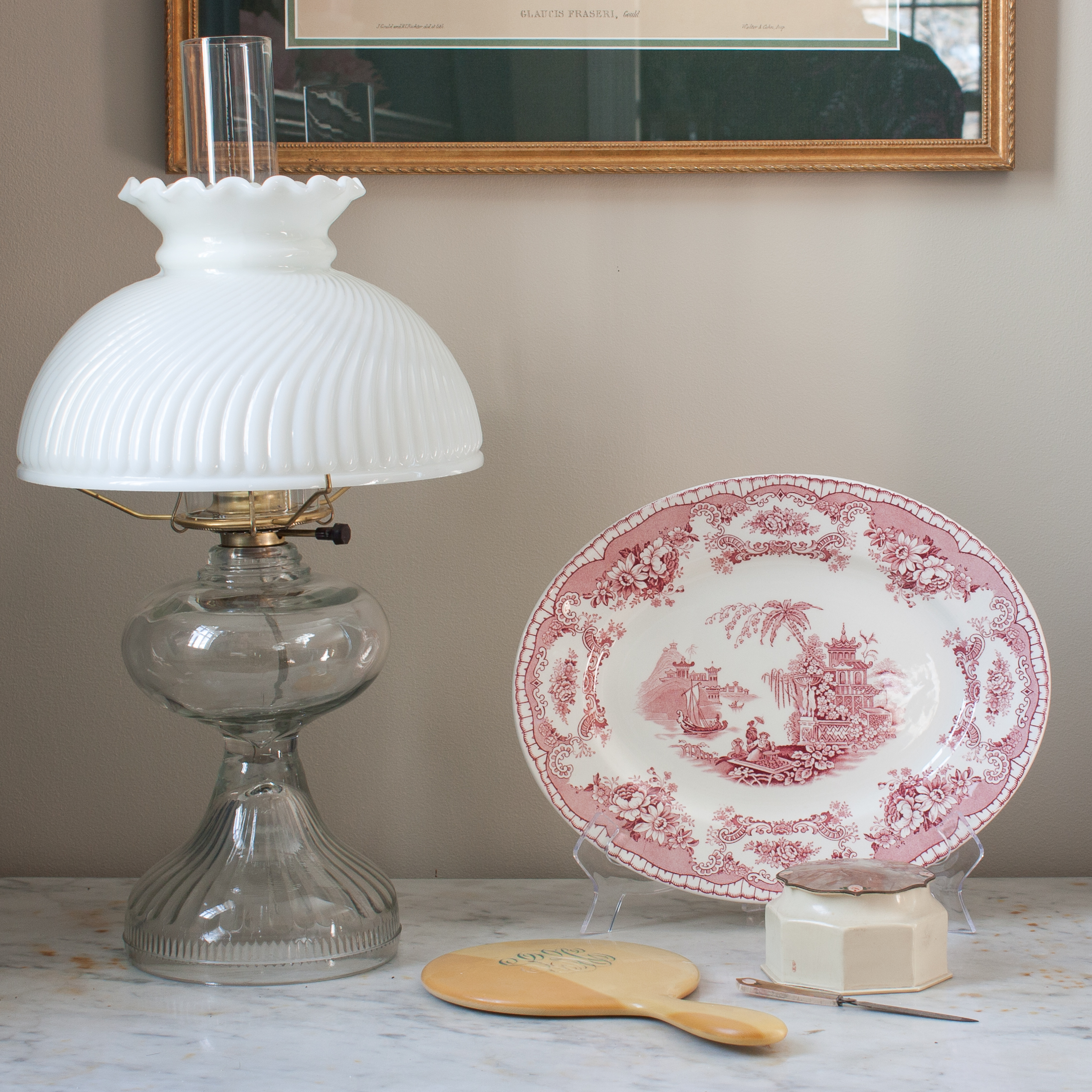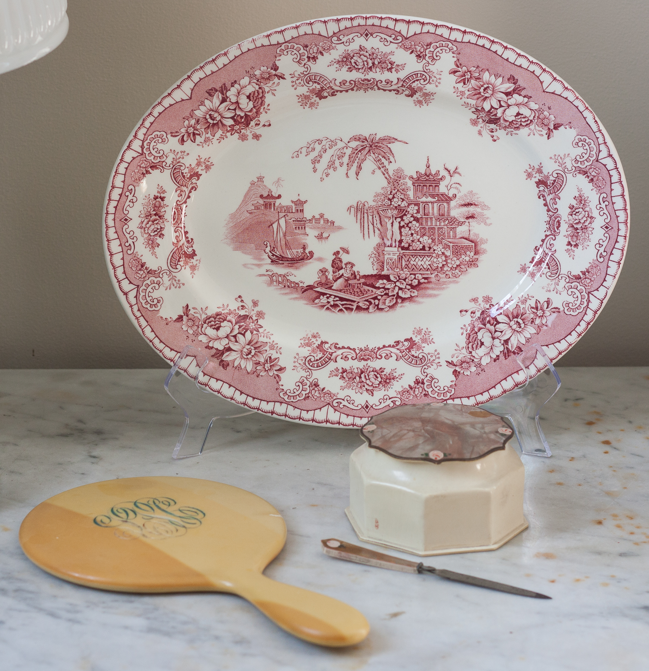 For the next table’s vignette, I started with a John Maddock & Sons “Bombay” transferware platter that belonged to my grandmother. I couldn’t figure out what to display with it, so I went shopping around my house, and found a few pieces of early 1900’s Celluloid Bakelite vanity set that belonged to my great-great aunt.