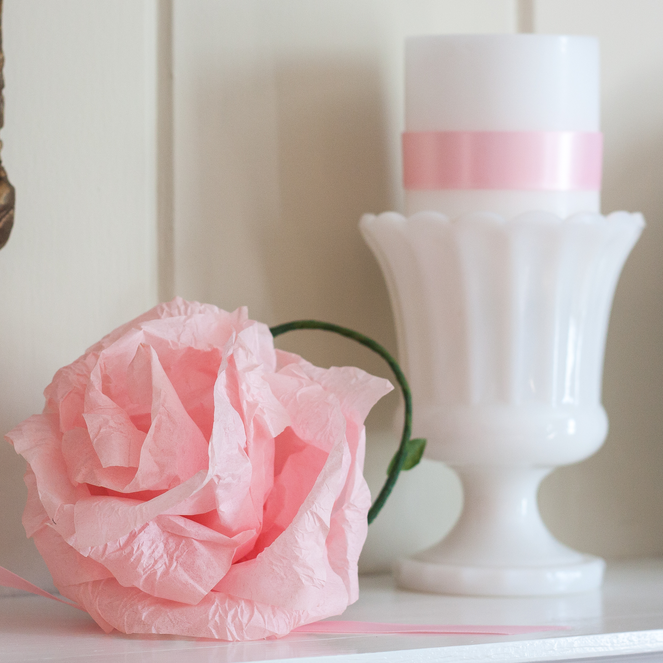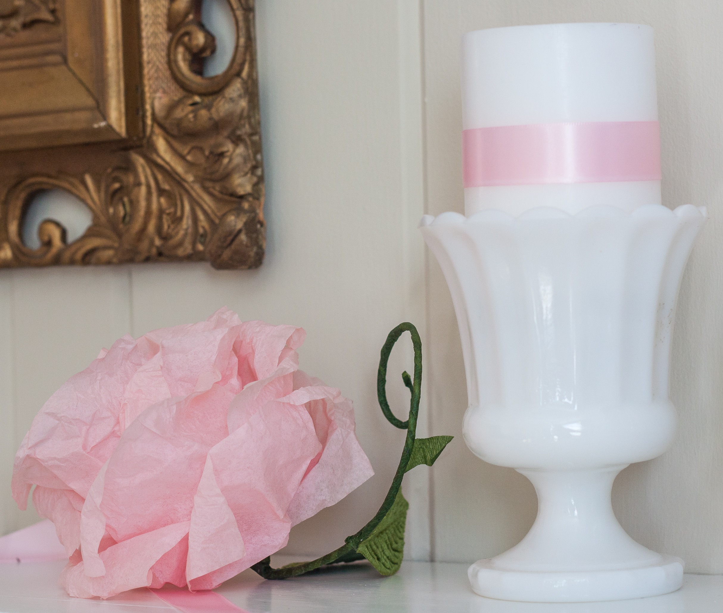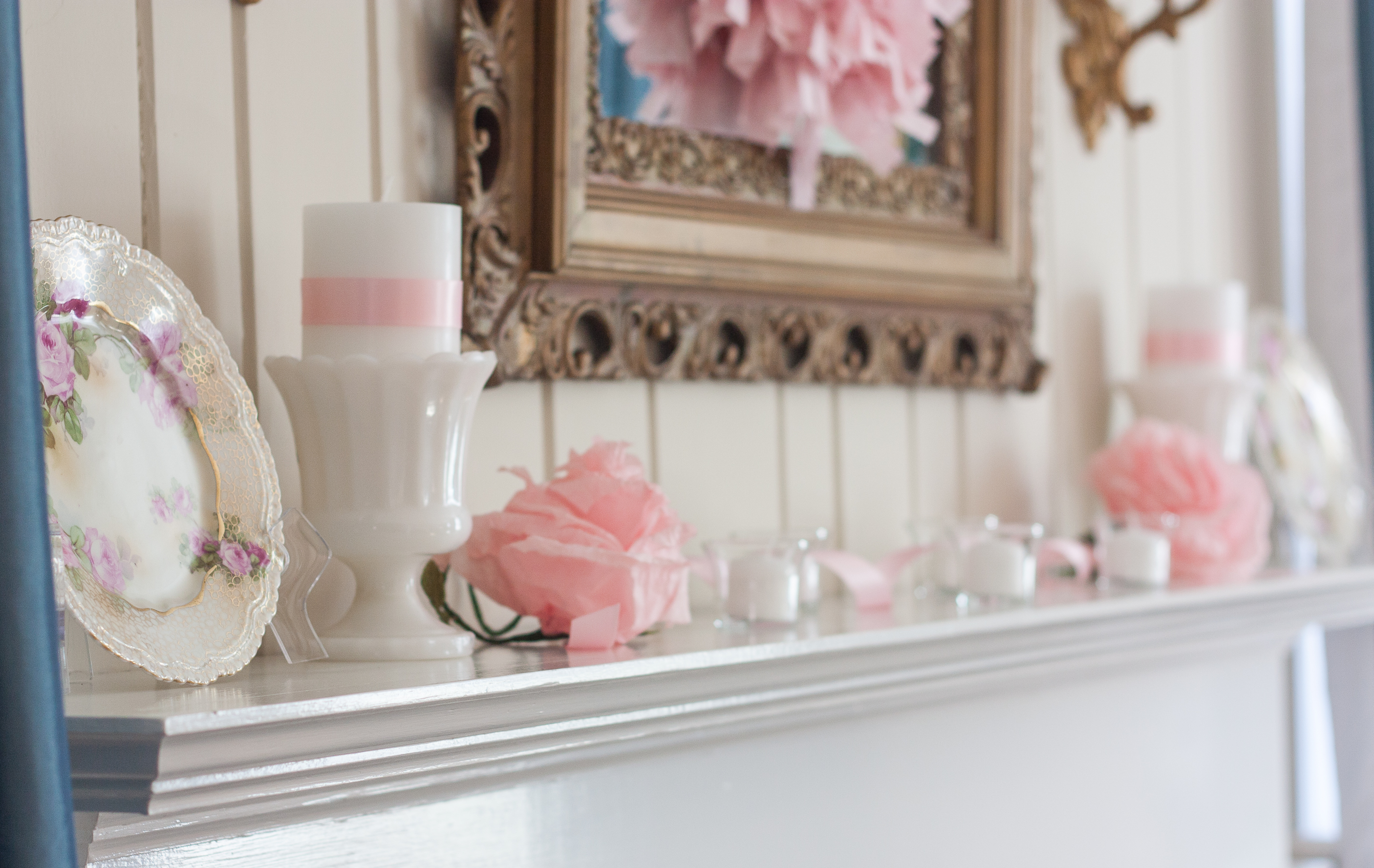 Milk glass vases filled with a pillar candles are next to the plates. To give the white candles a touch of color, I wrapped them in pink satin ribbon held in place with double sided tape.