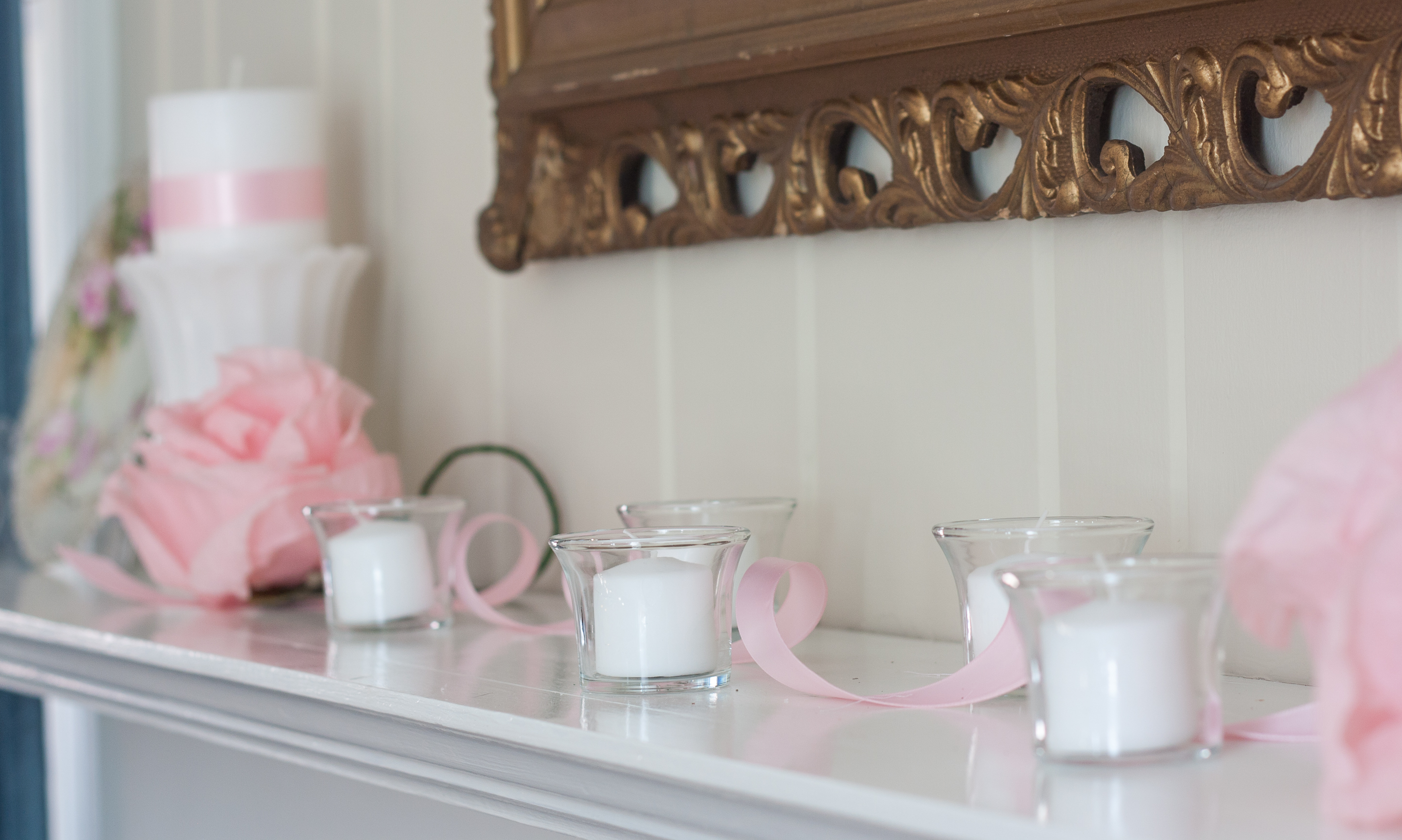 Clear glass votive holders hold white candles under the mirror. Pink ribbon curls its way through the votive holders.