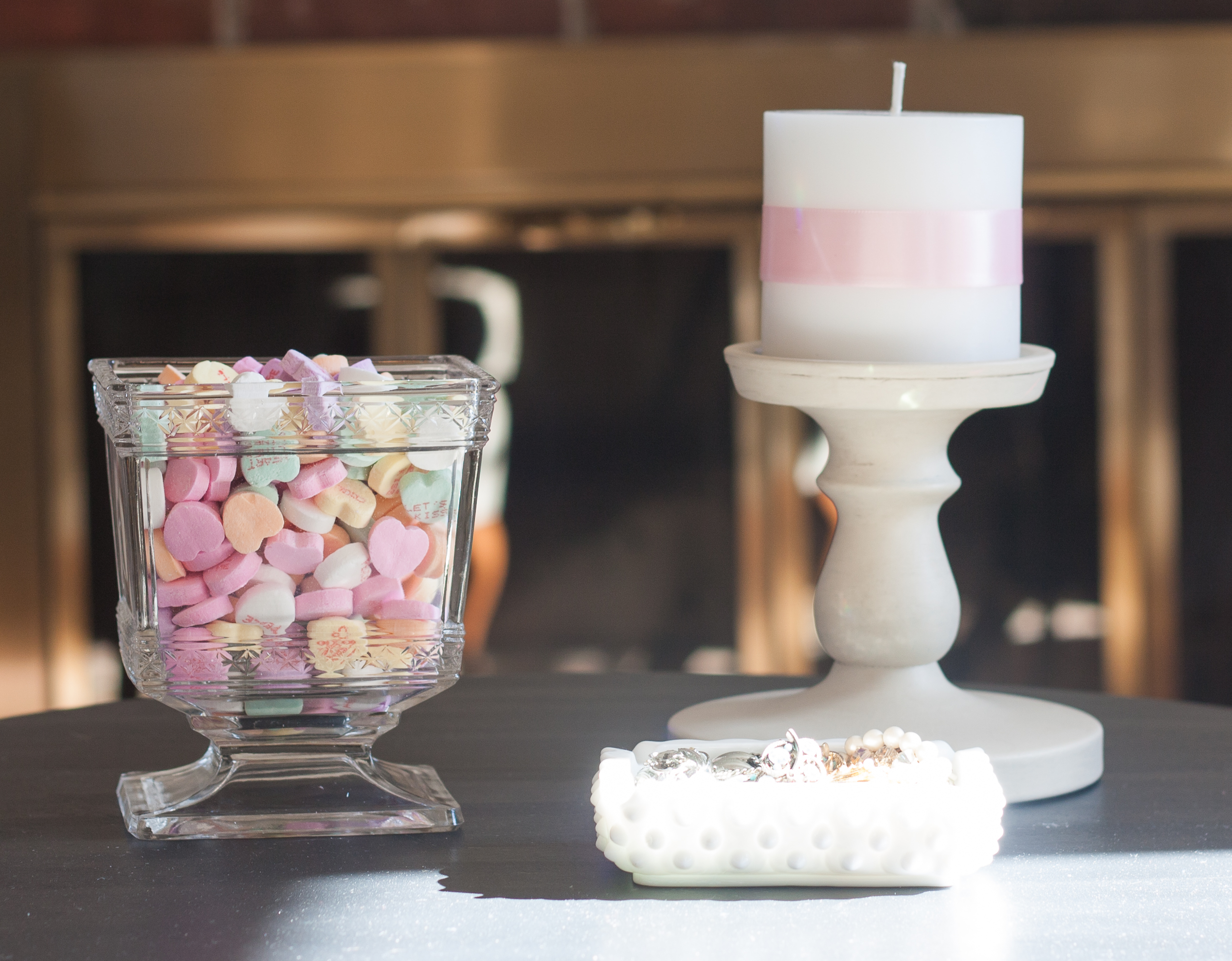 On the table between the wing chairs, I continued the romantic feel with another candle wrapped in ribbon, an antique glass vase filled with conversation hearts, and a milk glass ashtray filled with vintage jewelry.