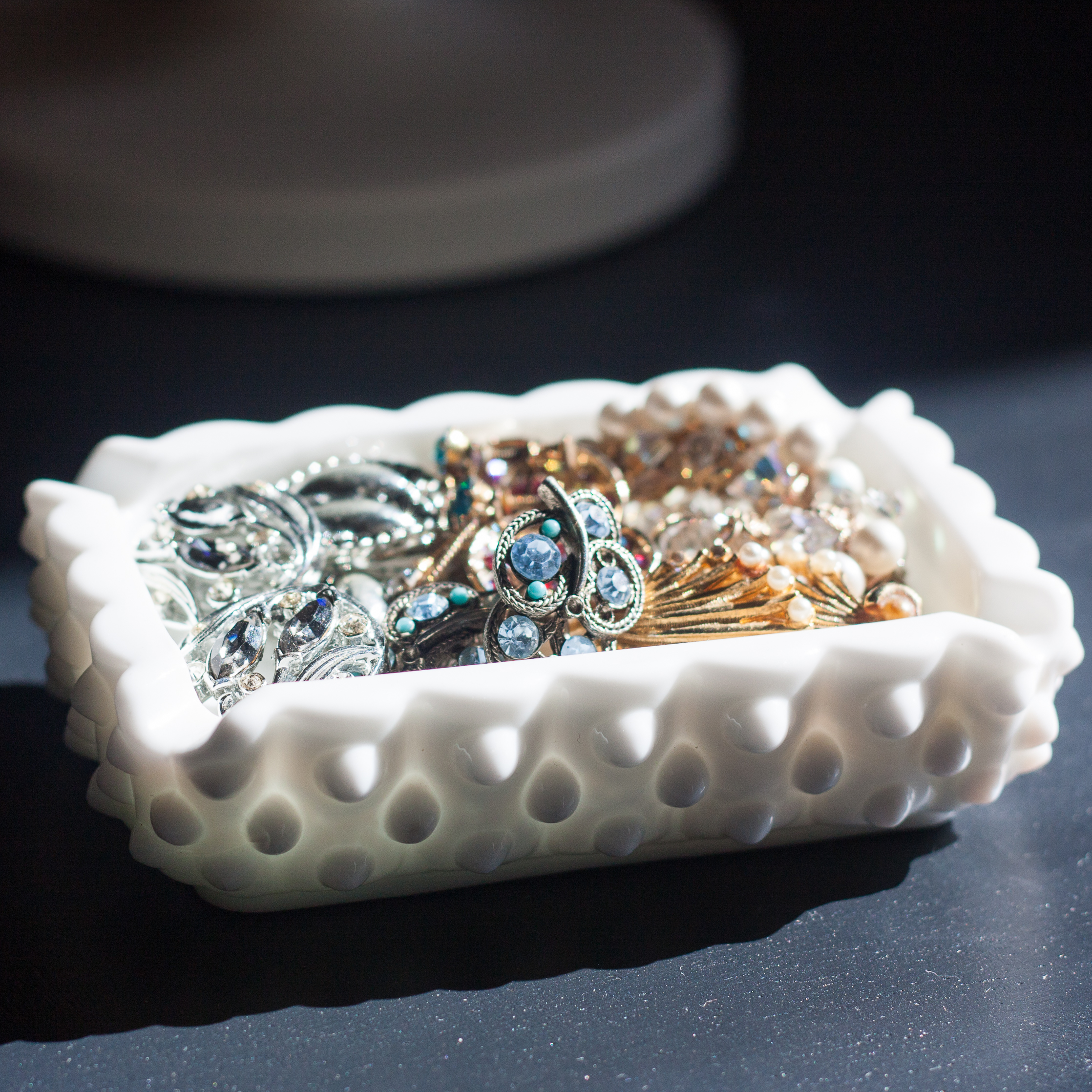 Vintage costume jewelry that belonged to my grandmother and great-great aunts glitters in the sunlight in the milk glass ashtray. You can see all of the vintage costume jewelry that I inherited here.