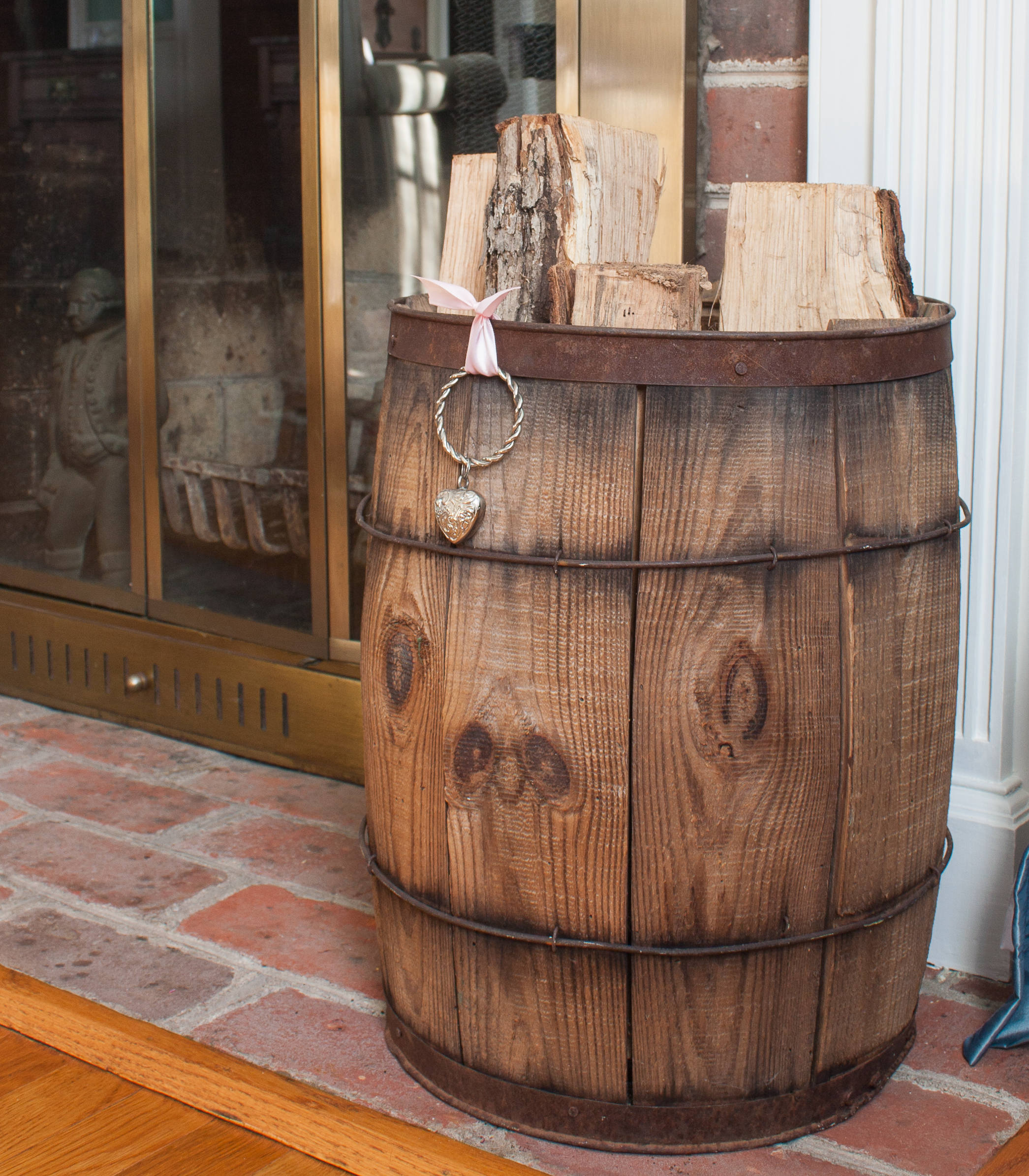 The wooden barrel on the fireplace hearth gets a touch of romantic decor with the addition of a heart napkin ring tied to the barrel with pink satin ribbon.