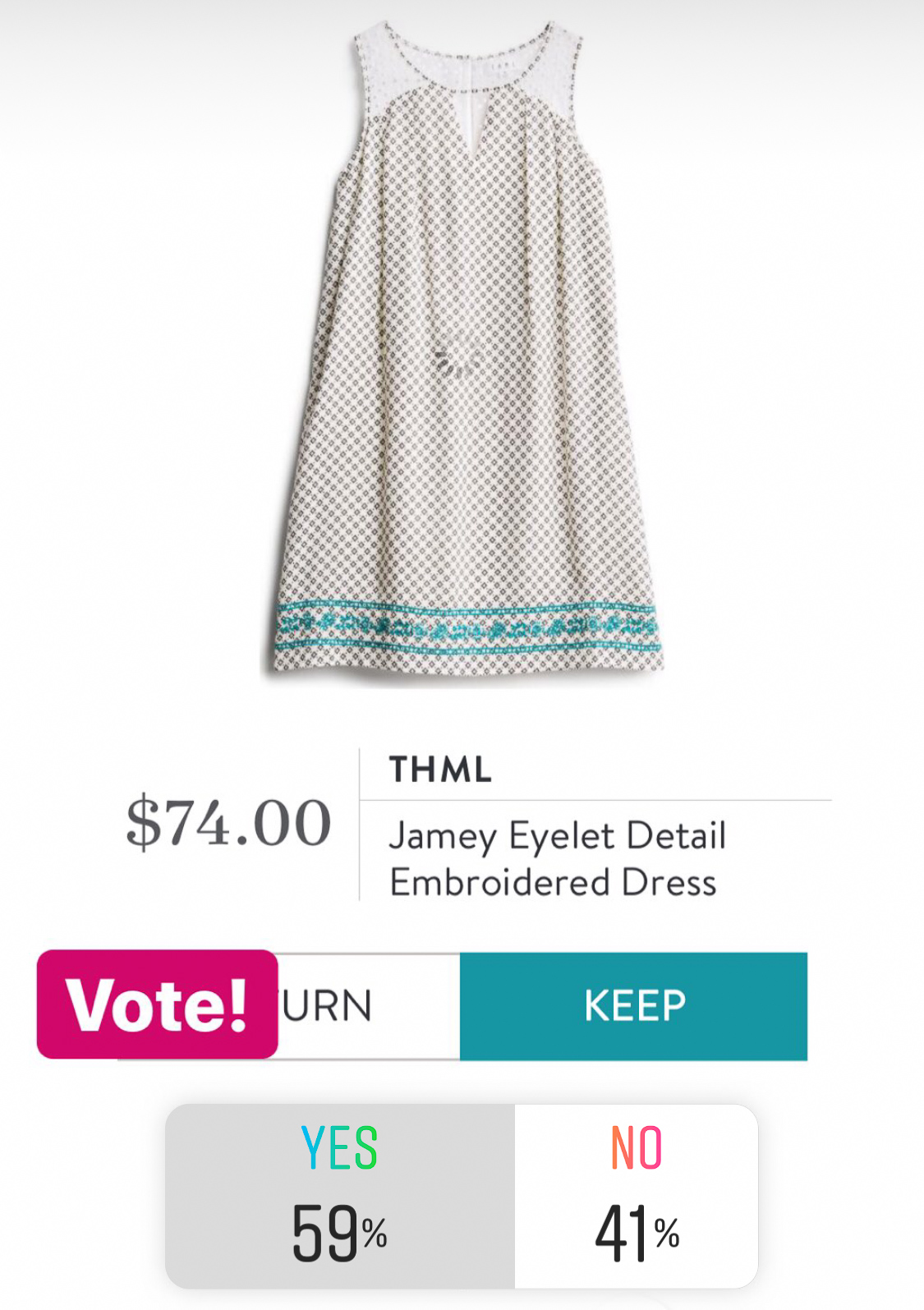 I have fun sharing what is coming in my Stitch Fix box in my Instastories and ask my friends on Instagram their opinion for each item.  People seemed to enjoy voting and I enjoyed seeing the results.  If you don’t already follow me on Instagram, I would love it if you did.THML Jamey Eyelet Detail Embroidered Dress