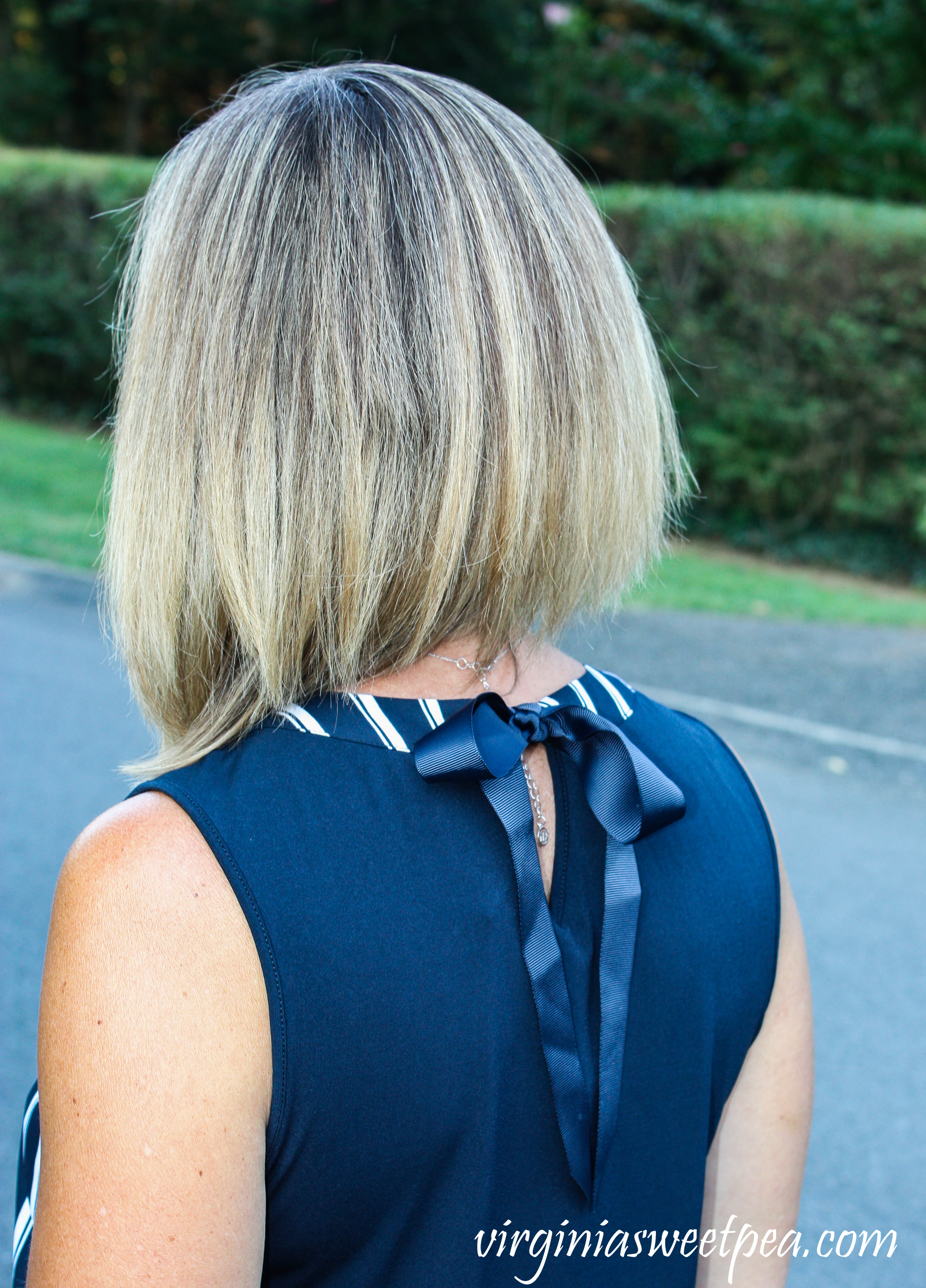 The back of this 41 Hawthorn Clearwater Mixed Material Blouse is solid blue instead of striped.  The neck has an adorable tie with grosgrain ribbonStitch Fix Review for August 2019 - 41 Hawthorn Clearwater Mixed Material Blouse