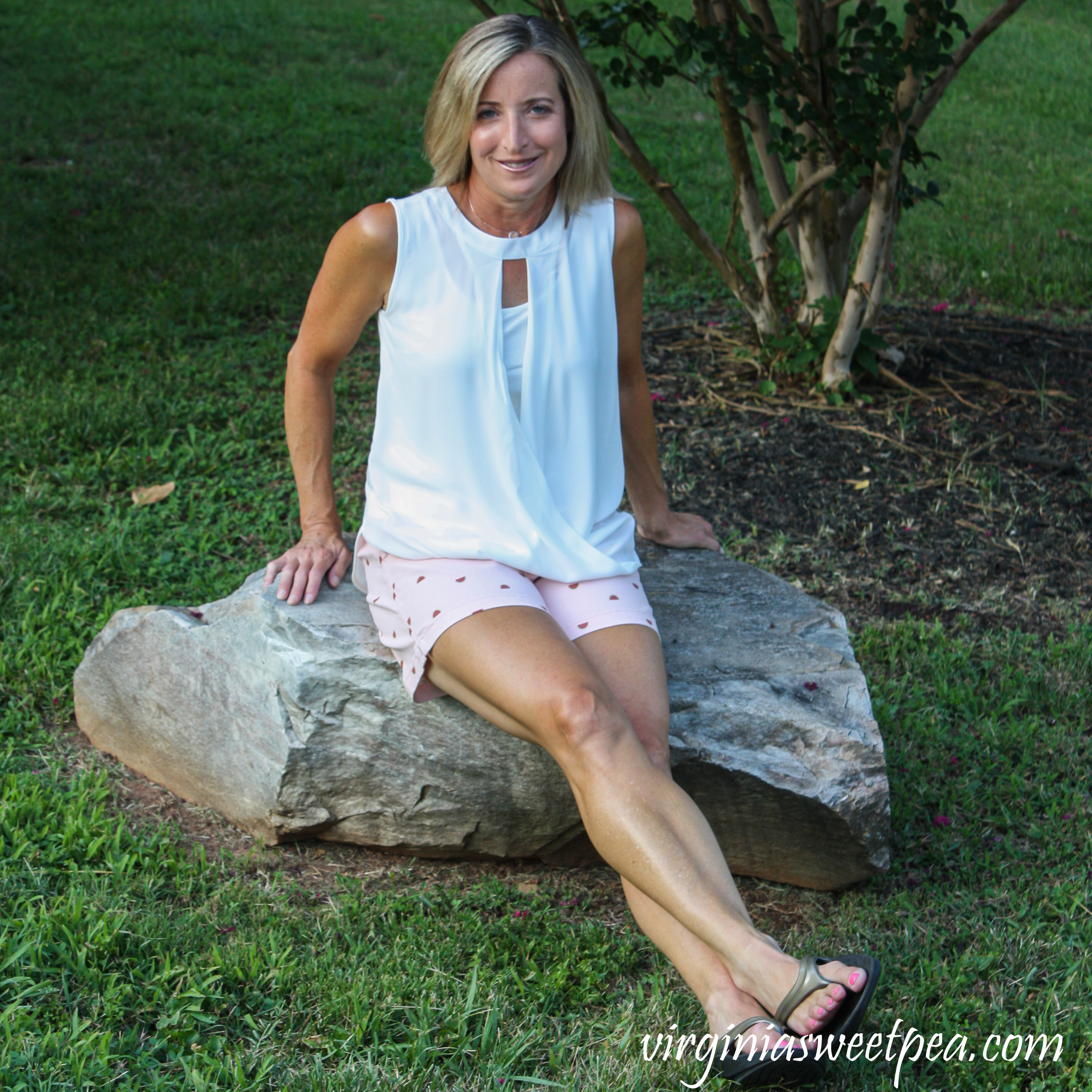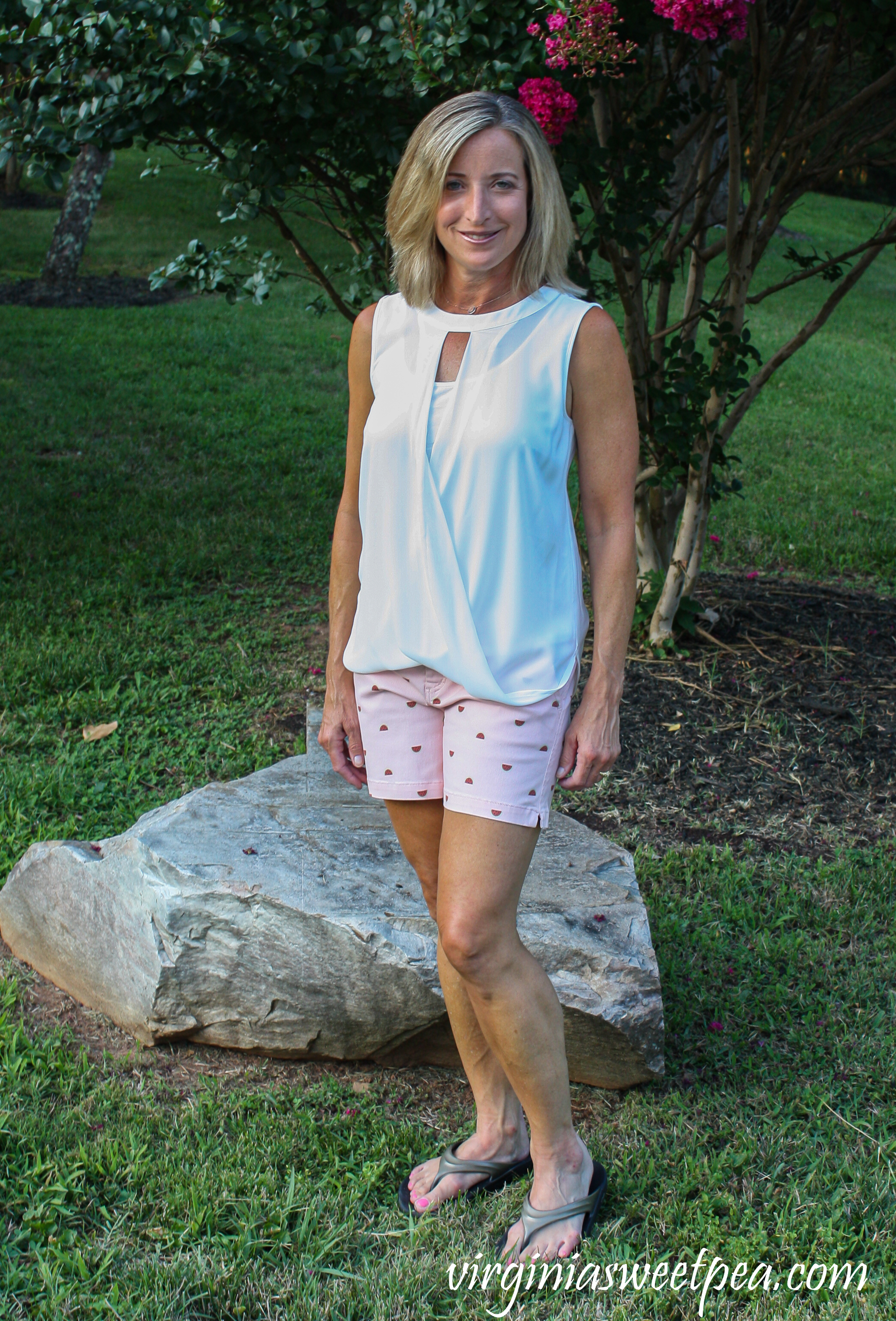 These adorable Market & Spruce Lorraine Printed Shorts in pink with watermelons are so fun for summer and like Brittany suggested, I paired the shorts with the 41 Hawthorn Clearwater Mixed Material Blouse.Stitch Fix Review - 41 Hawthorn Clearwater Mixed Material Blouse with Market & Spruce Lorraine Printed Shorts