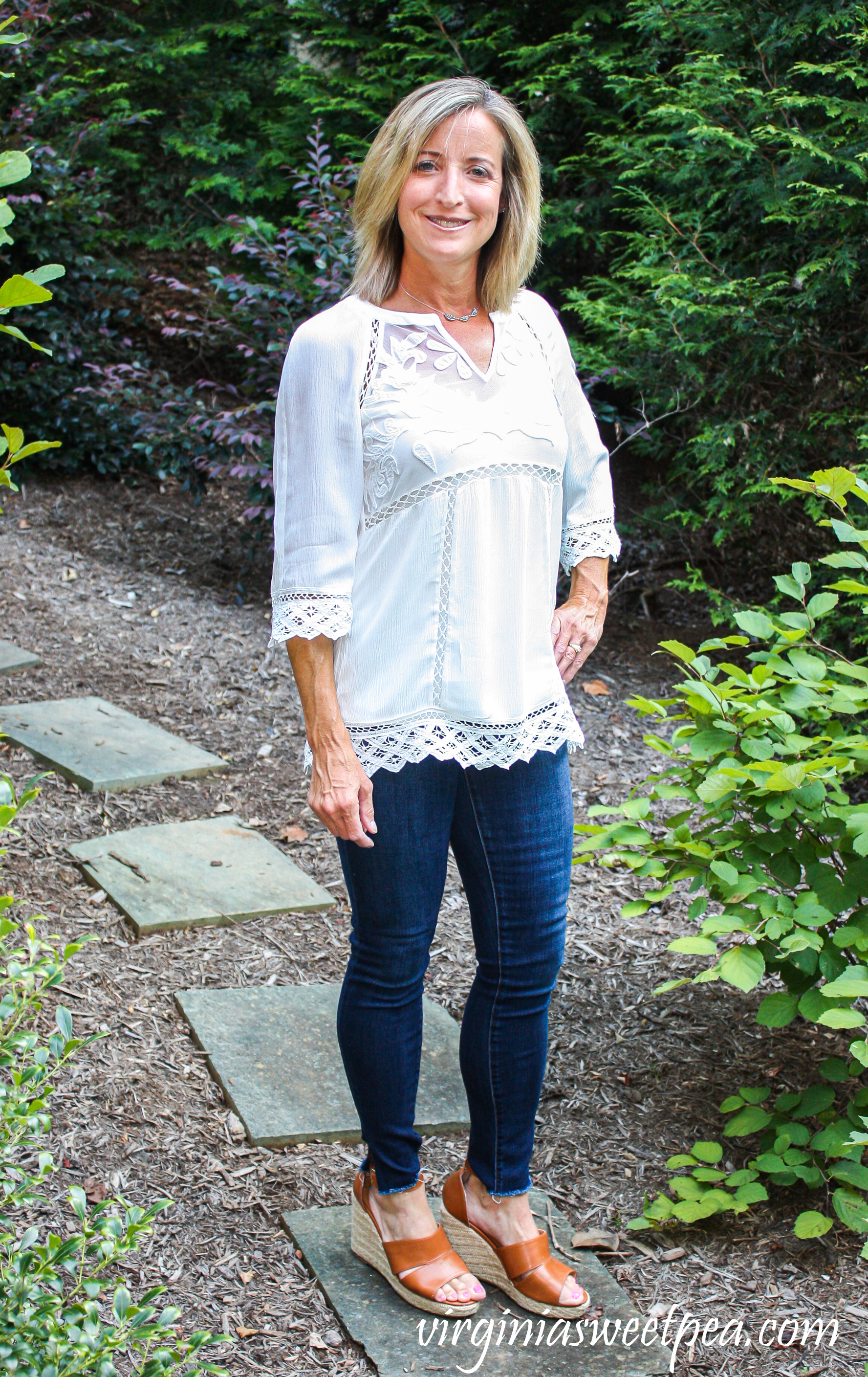 I paired this top with a pair of white Old Navy capris (similar) and shoes that I’ve had for years.  My necklace is my latest Rocksbox purchase.Stitch Fix Review for August 2019 - 41 Hawthorn Clearwater Mixed Material Blouse