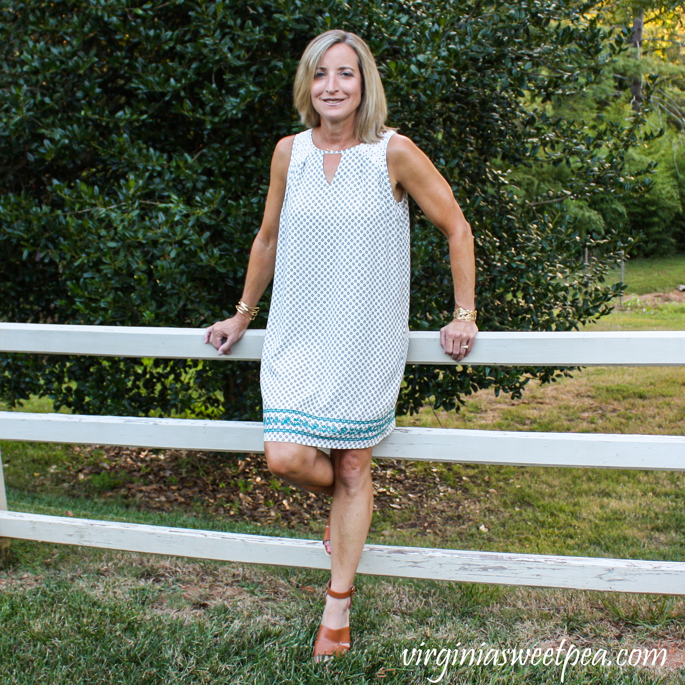I paired this THML Jamey Eyelet Detail Embroidered Dress with shoes from Walmart that are a knockoff of a popular Sam Edelman style.  You can’t beat Walmart’s $19.99 price with free shipping to the store!  Stitch Fix Review for August 2019 - THML Jamey Eyelet Detail Embroidered DressAll of the other jewelry that I’m wearing in this post is from Rocksbox.  Rocksbox is a jewelry subscription service that sends three pieces of jewelry that you can wear for as long as you like each month.  When you send your three pieces back, or buy what you like, a new box is sent.  If you’d like a free month of Rocksbox, sign up with this code: PAULABFF54.  I rejoined Rocksbox a year ago in January and I love their service.  I’ve received the cutest jewelry and have purchased quite a few items.