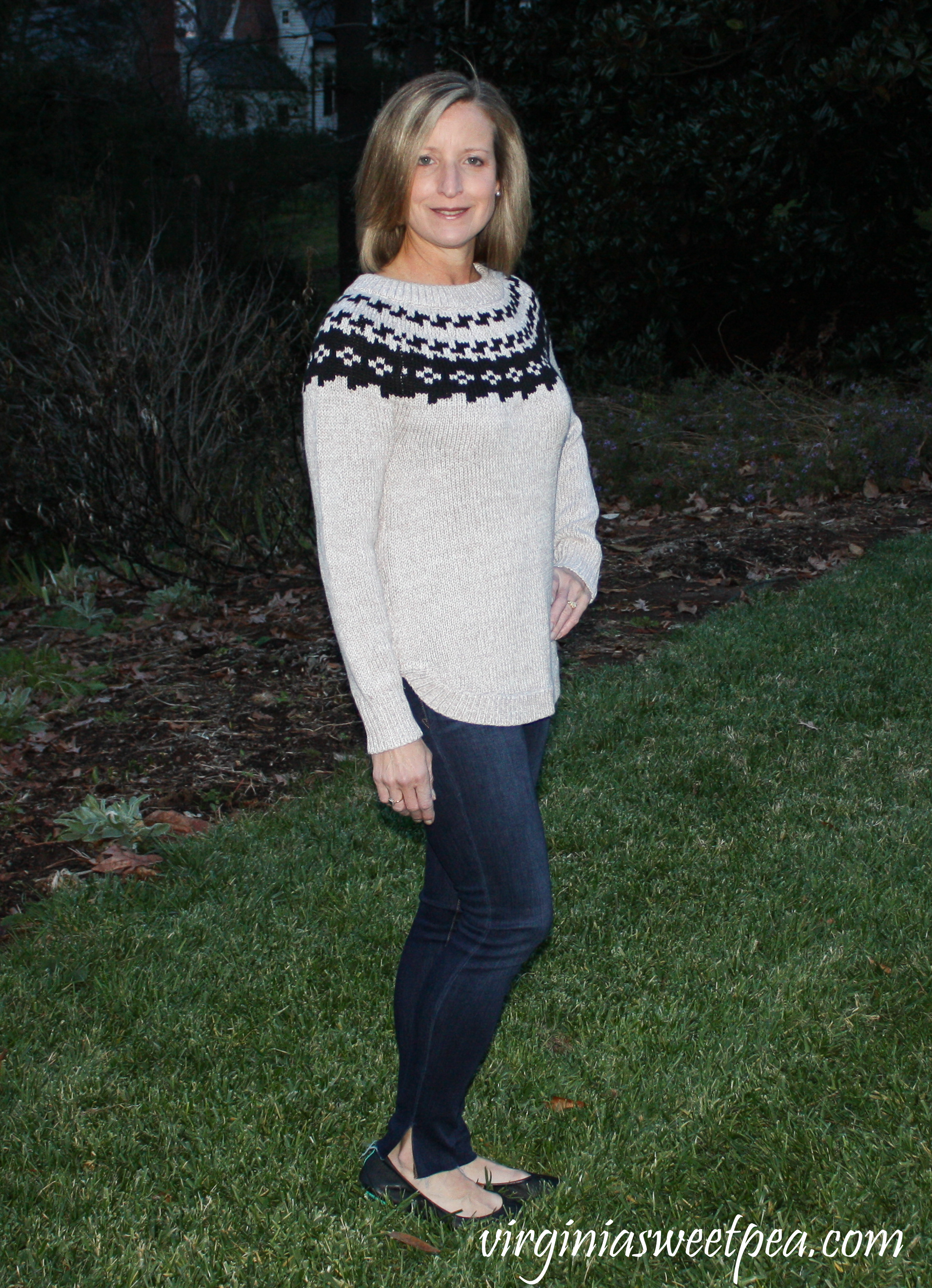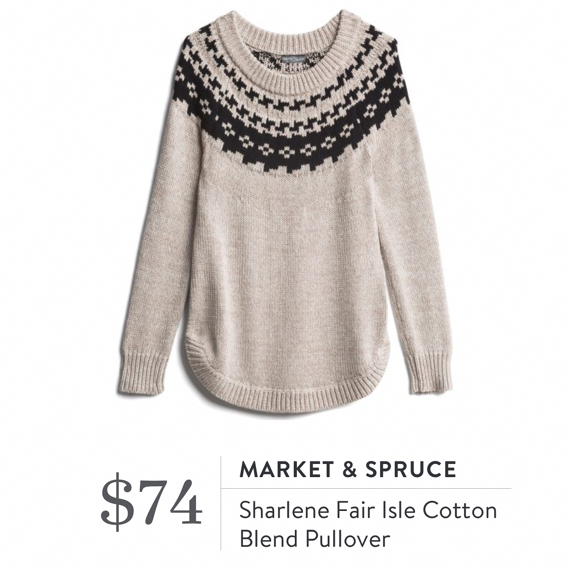 I love the sweater, too! Especially the bottom, you don’t see that cut on a fair isle usually. Good choice!