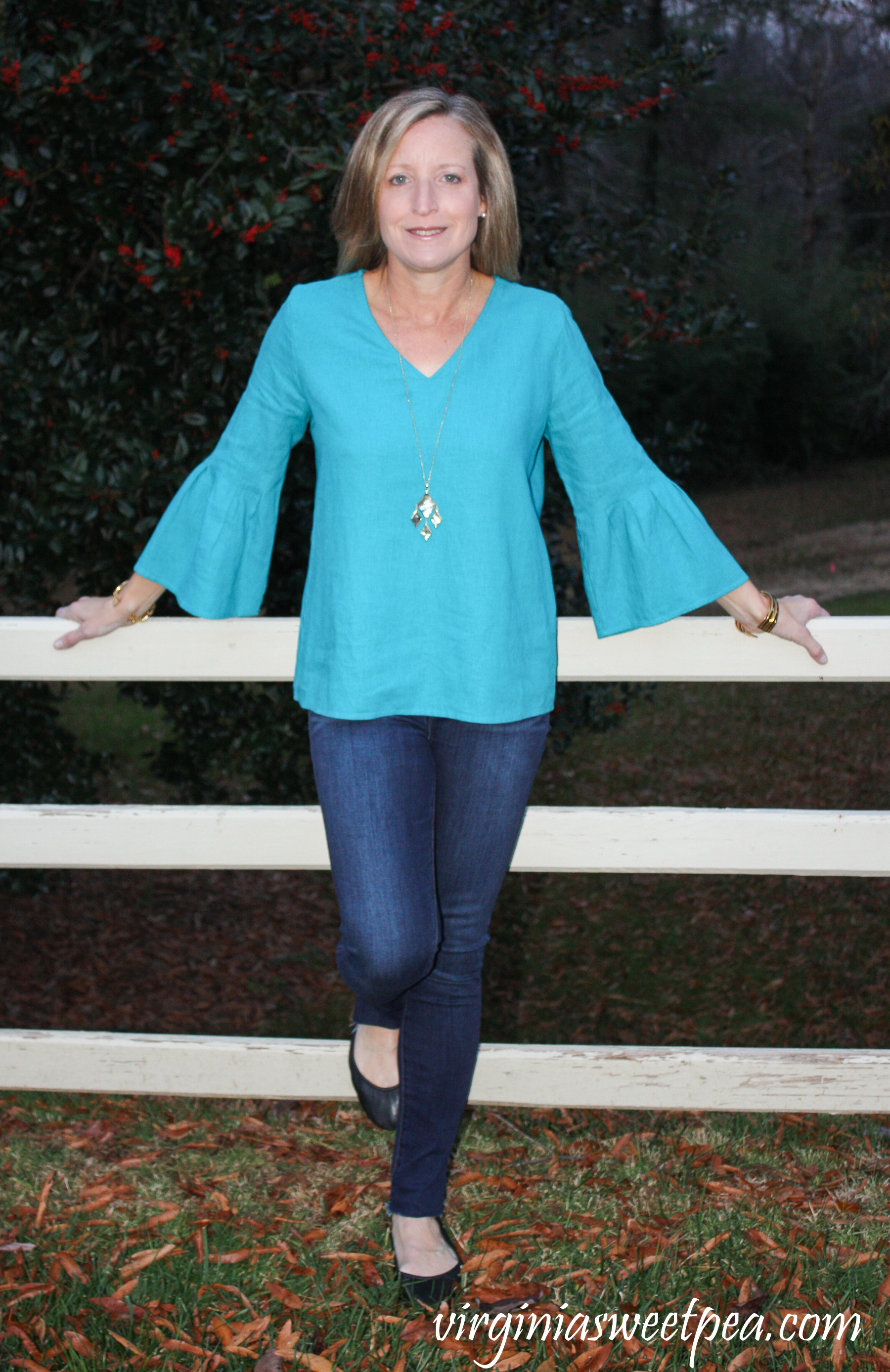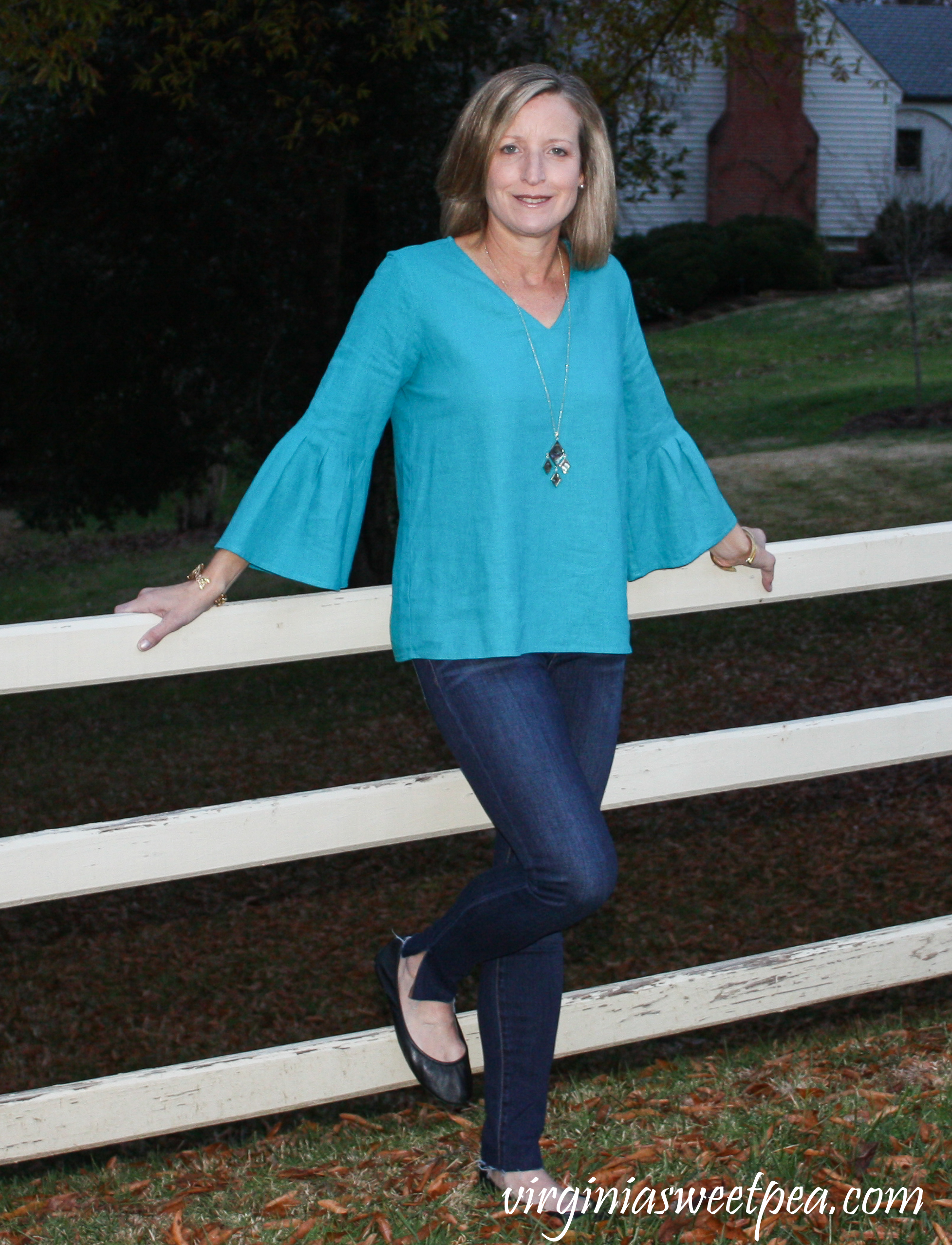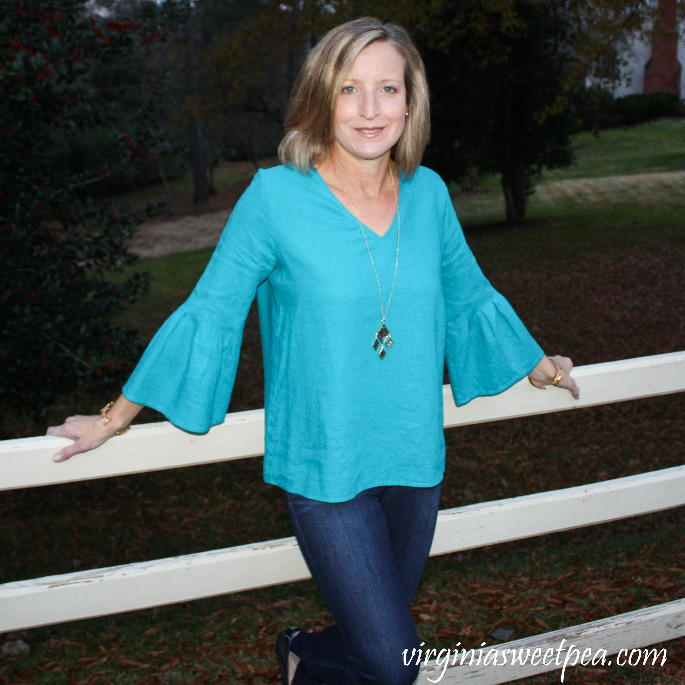 I loved the style and color of this bell sleeved top. The v-neck is flattering and it’s a top that really could be worn year-round.