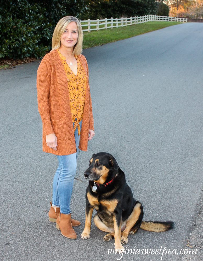 As we were taking pictures, our neighbor came home and after she oohed and awed over Sherman, she did the same over my outfit.