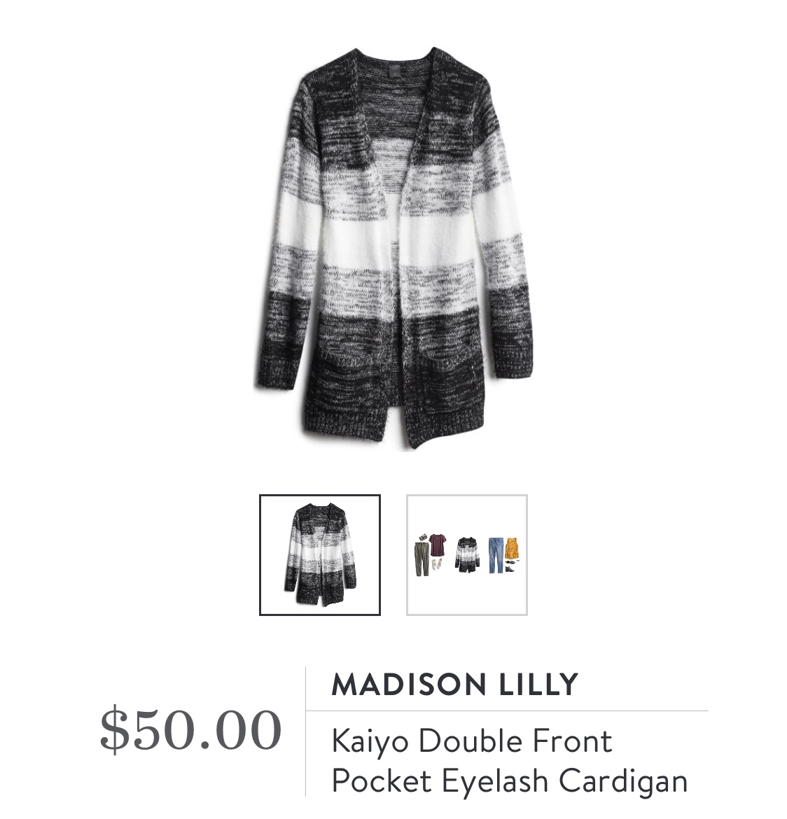 I paired this Madison Lilly Kaiyo Double Front Pocket Eyelash Cardigan with a black blouse from a previous Fix and black booties from Payless.