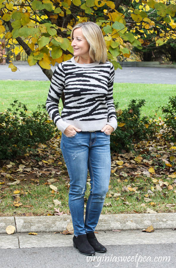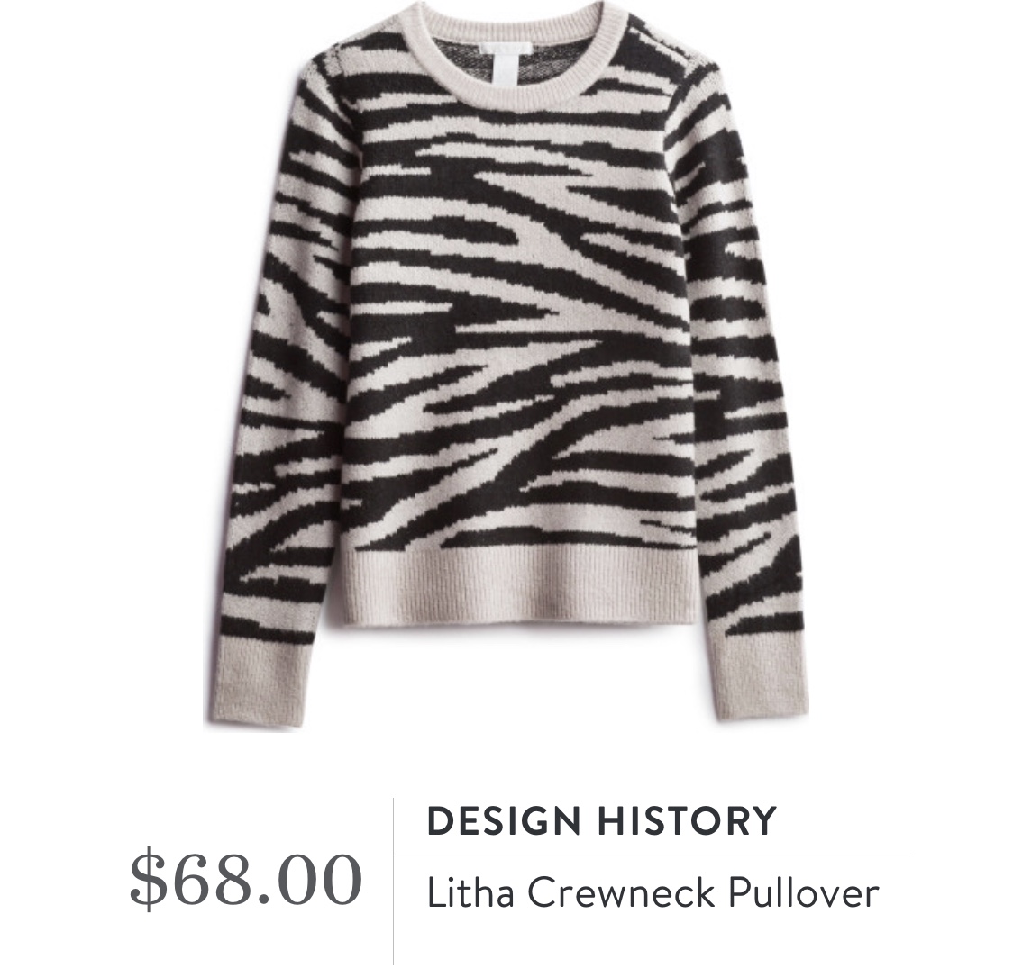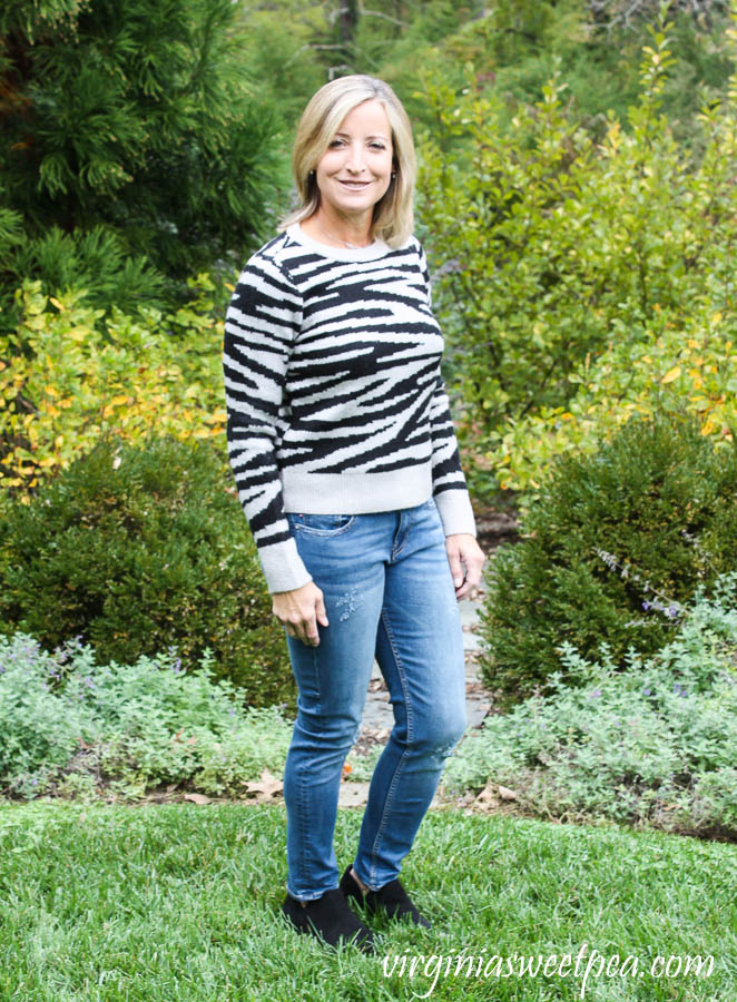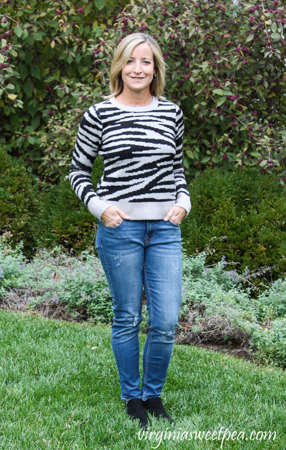 I am loving the animal prints that are so popular this fall. Last month I fell in love with the leopard print Fortune+Ivy Alannis Dolman Sleeve Knit Top that Brittany sent and this month I was excited to see this Zebra striped Design History Litha Crewneck Pullover coming my way.