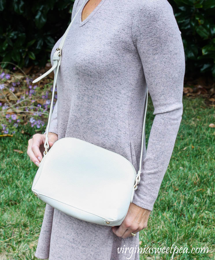 I liked this bag but didn’t at all like the color. I’m old fashioned and a white bag isn’t something that I would carry in fall or winter. For my trip, I ordered this $15.99 crossbody bag from Amazon that’s a great size for travel and it comes in 26 colors.