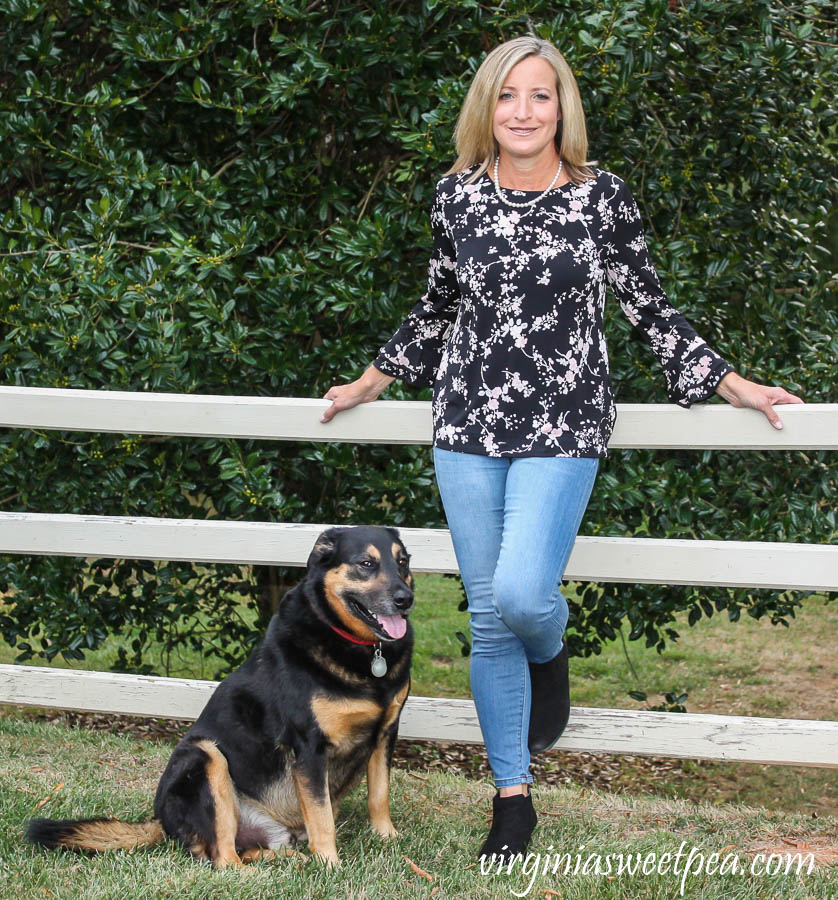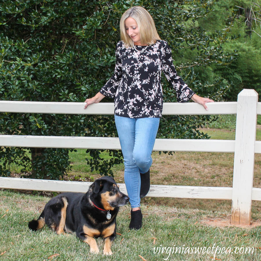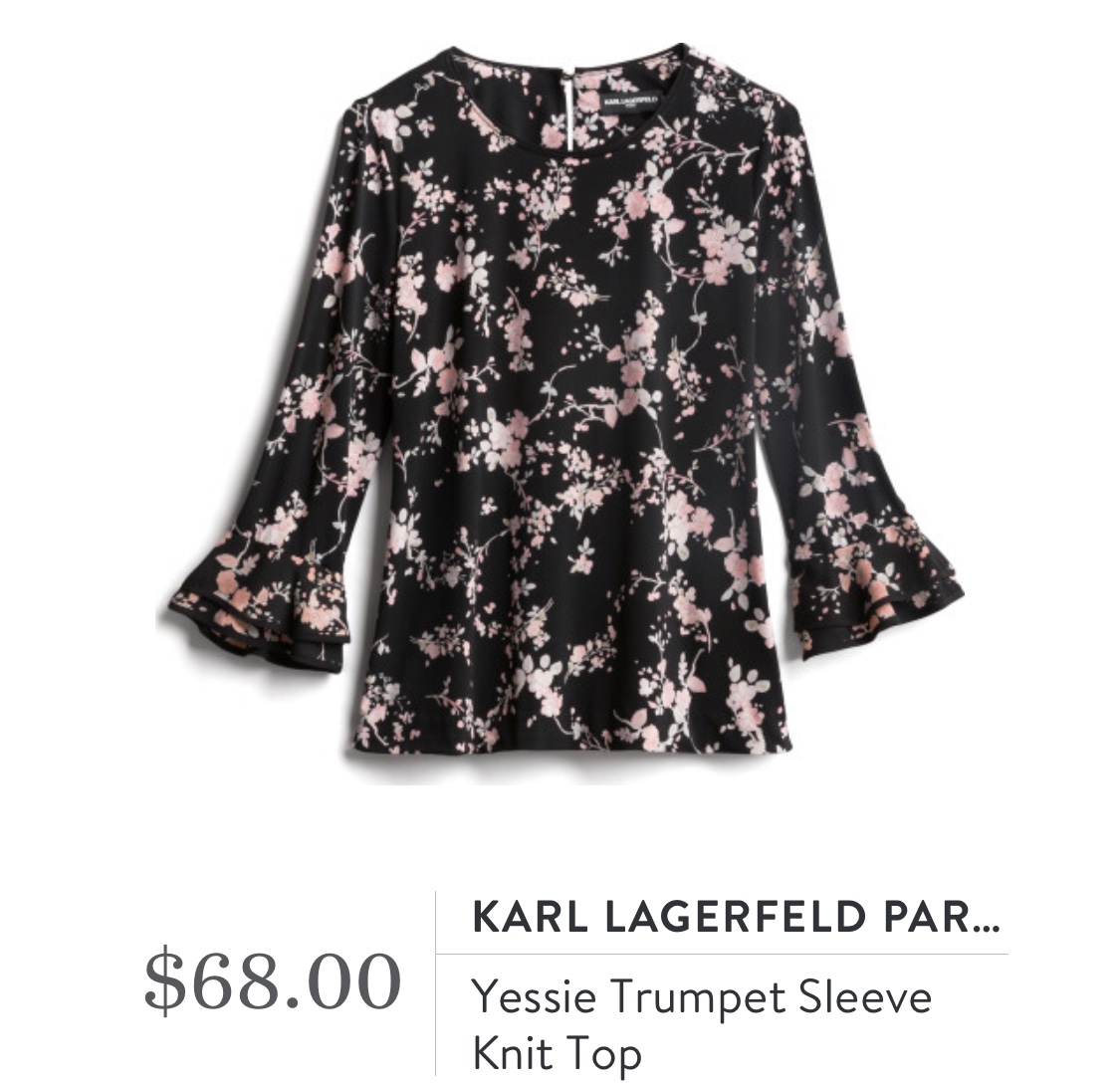 This Karl Lagerfeld Paris Yessie Trumpet Knit Top is silky soft and has a slight amount of stretch making it very comfortable.  I love its floral pattern and also the trumpet detail of the sleeves.Stitch Fix Review for October 2019 - Karl Lagerfeld Paris Yessie Trumpet Sleeve Knit top
