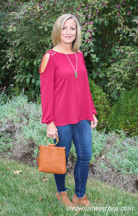 Red is my favorite color and this burgundy red is perfect for fall.  I can wear this with jeans or dress it up by pairing it with a skirt.  I’m already planning to wear it with the Edyson skinny cords from my November 2019 Fix.