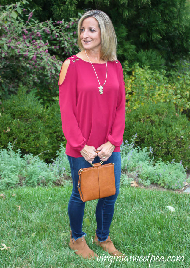 When I got notification that my Stitch Fix box was on the way, I peeped at my Stitch Fix app to see what I was receiving this month.  For some reason my eye skipped over the word blouse and I thought that this top was a sweatshirt and I wasn’t terribly excited about receiving it.  When I pulled it out of the box and realized it was a blouse, my opinion changed.  I slipped this Papermoon Ilma Cold Shoulder Grommet Detail Blouse on and immediately loved it.Stitch Fix Review for October 2019 - Papermoon Ilma Cold Shoulder Grommet Detail Blouse with Sole Society Handbags Duff Crossbody