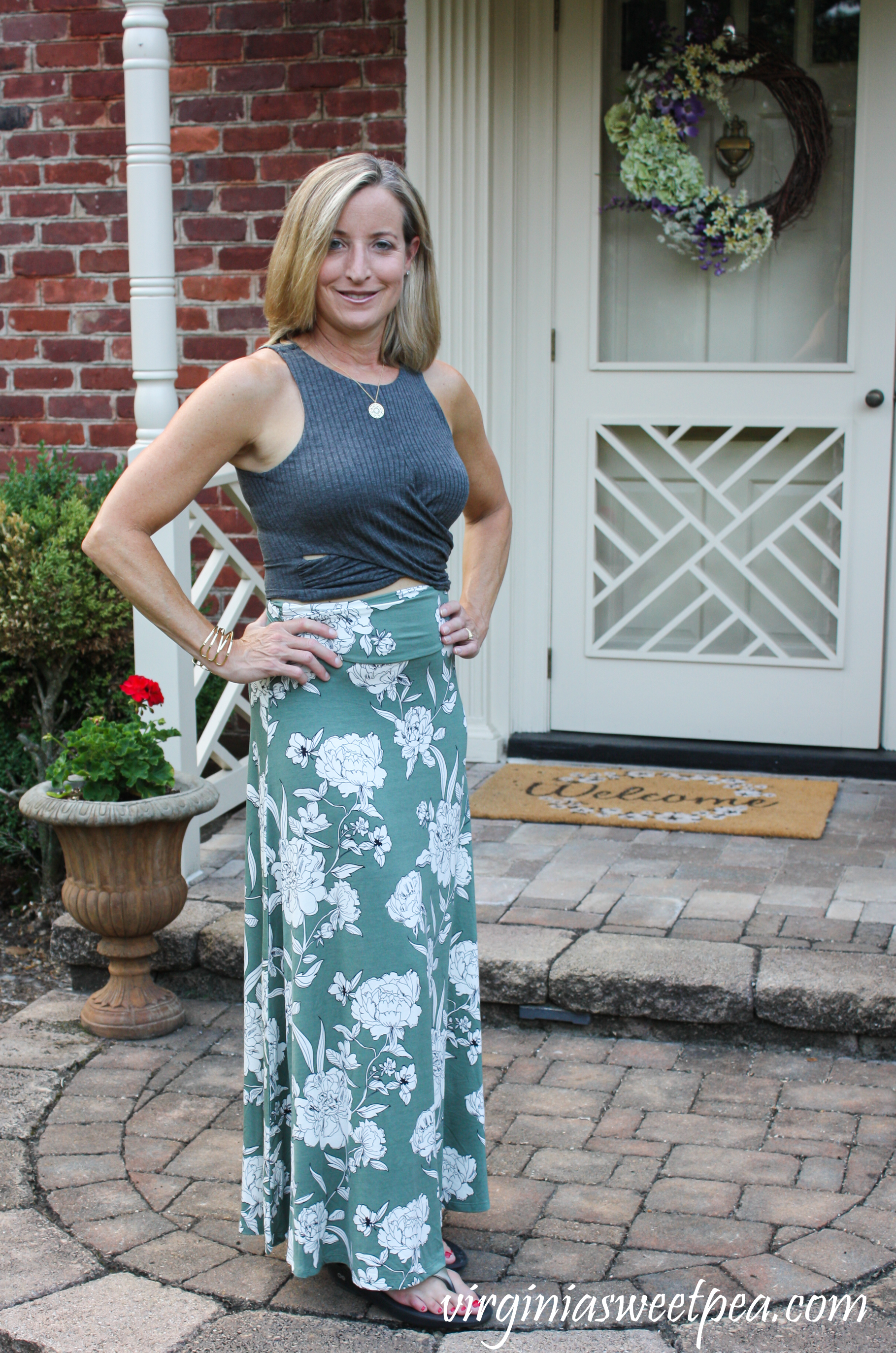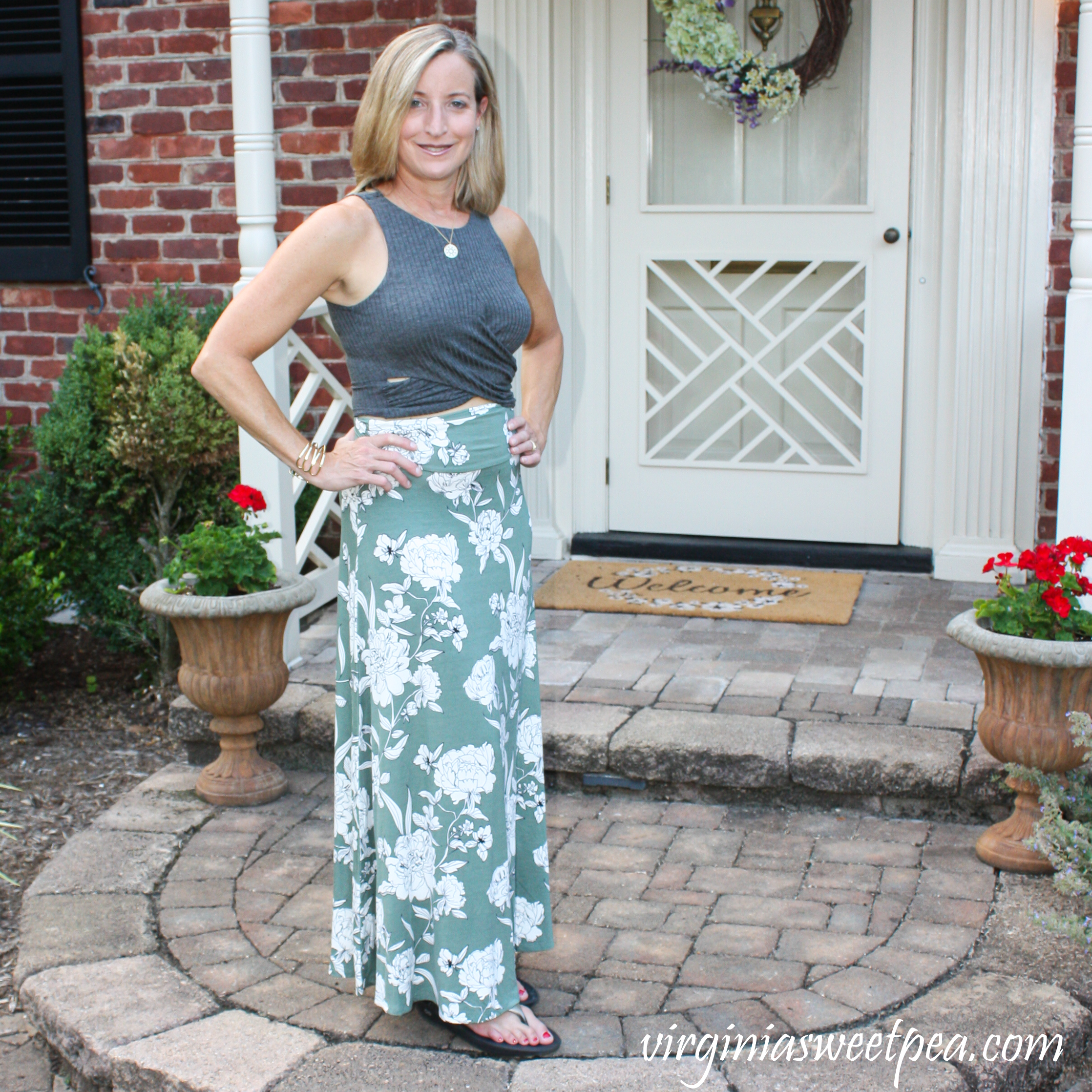 What was I thinking when I pinned the Dee Elly Bess Sleeveless Crop Top?? Unfortunately it was one of the first things on my Pinterest board and Brittany sent it to me. Don’t get me wrong, I think this top is adorable, just not adorable on a newly 50 and a little thick in the middle woman. Now my 19 year old niece, she could ROCK this crop top. Brittany suggested that I try this crop top with the maxi skirt and I do like them together, just not on me.