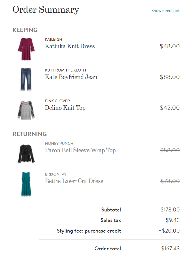 Stitch Fix is a personal styling service. When you sign up for Stitch Fix, you fill out a detailed style profile that helps your stylist know your likes and dislikes. Since I’ve received 47 Stitch Fix shipments, my stylist knows my likes and dislikes very well and I almost always like every item in my Fix, a good problem to have!