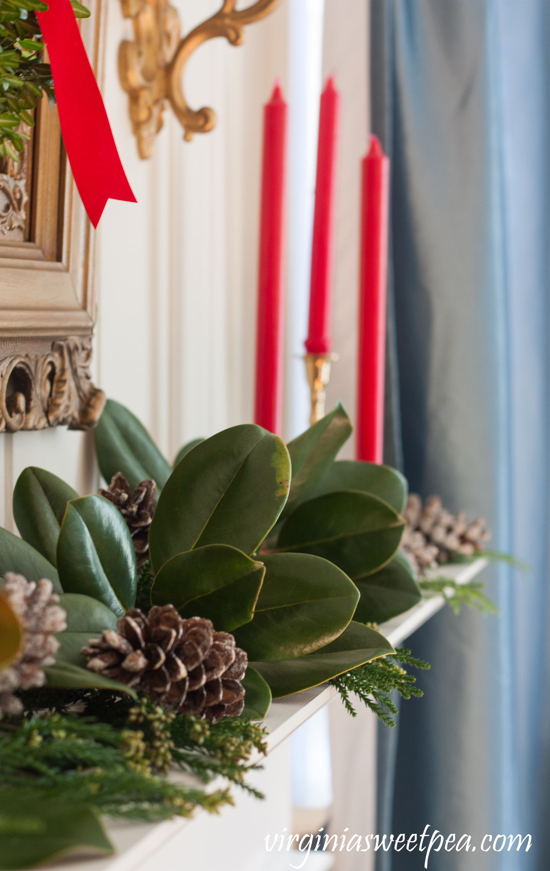 Your mantel is beautiful. I love the simplicity of it – greenery, candles and pine cones. Very elegant and festive. I always enjoy your stories about the history of the decorations you share from your homes. It makes all the decorating you do that much more interesting and beautiful.