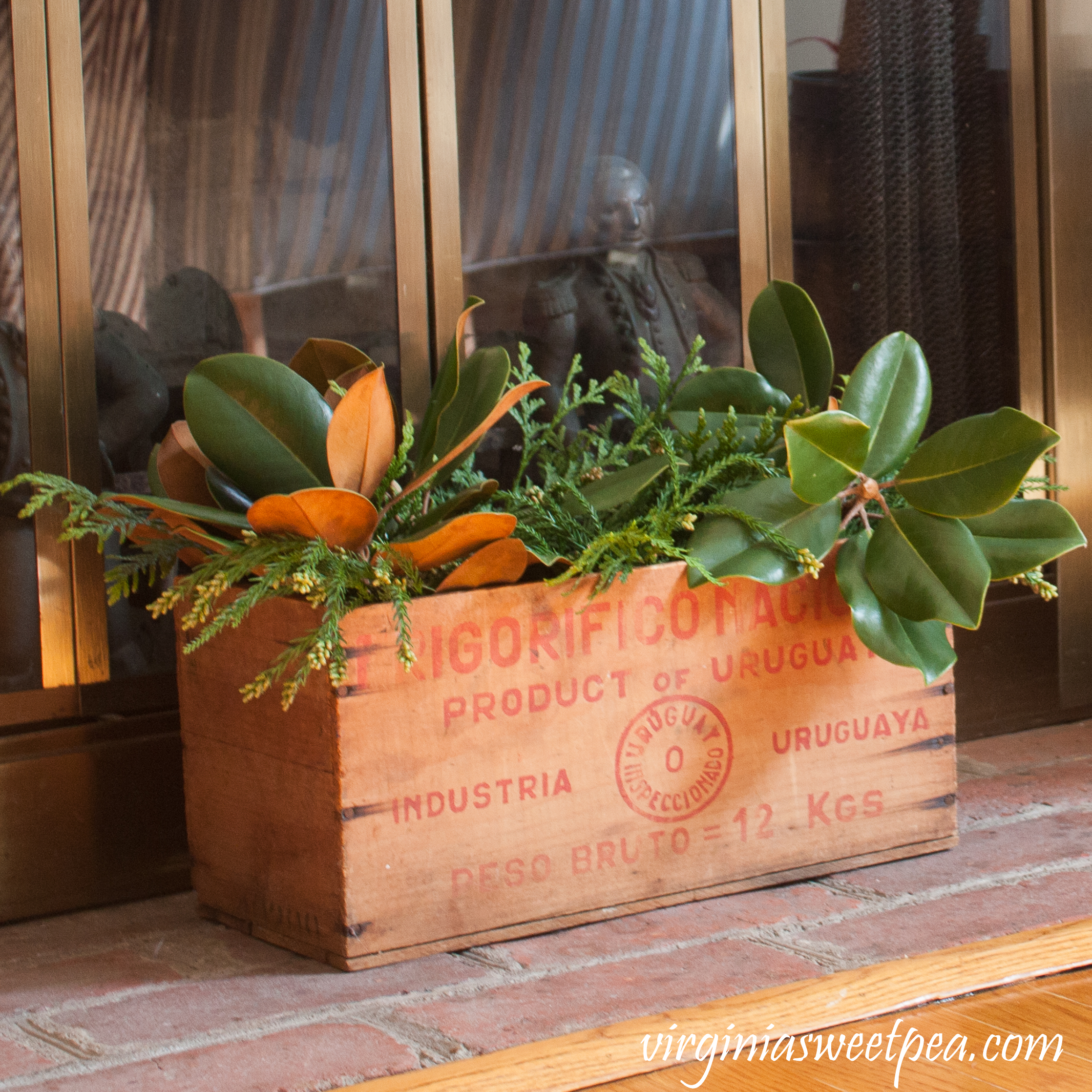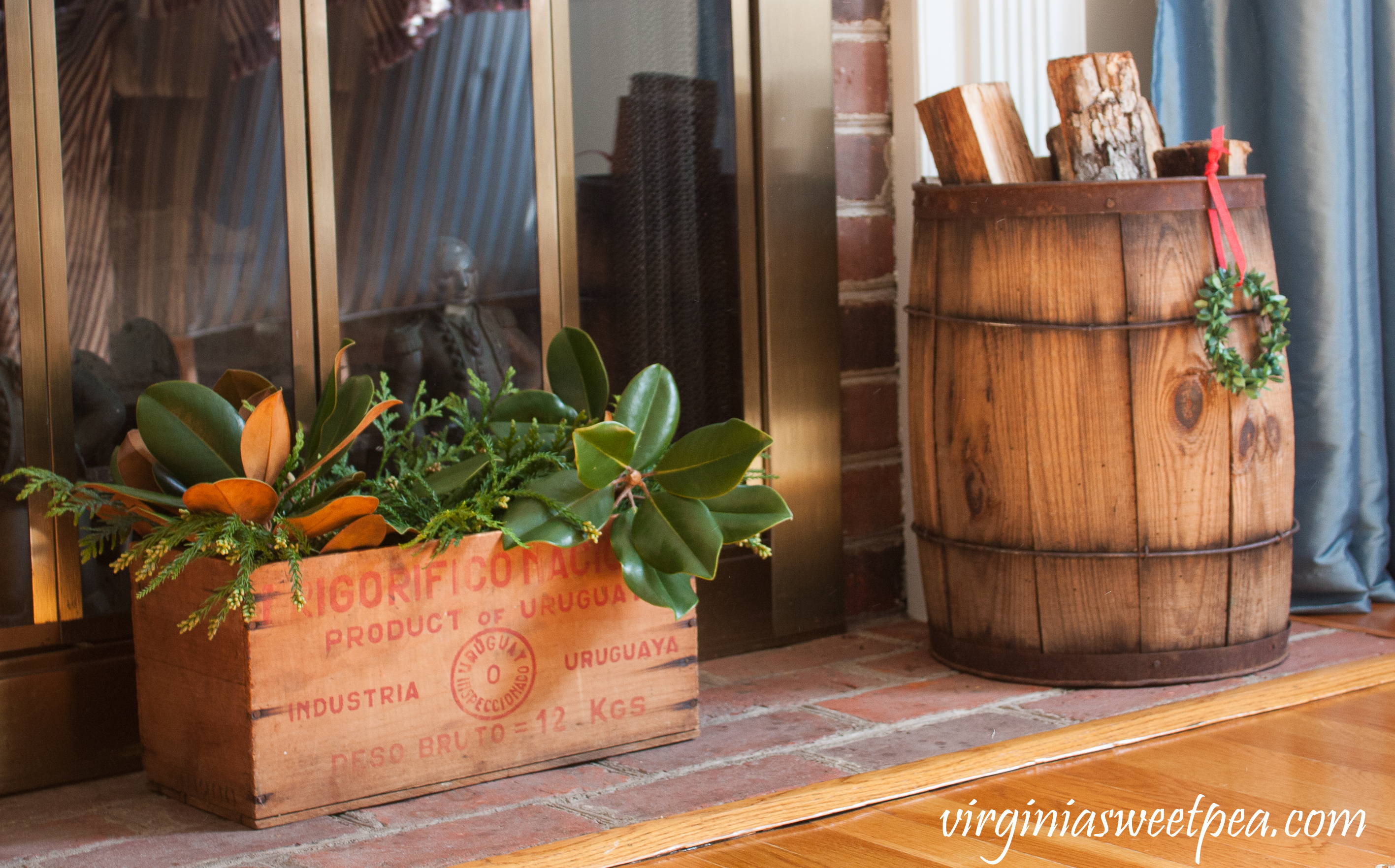A vintage box filled with greenery along with a wood barrel filled with wood grace the hearth. The fireplace tools are from Virginia Metalcrafters which sadly has been closed for many years. If you have brass in your home, if it is marked with VM, it’s from Virginia metalcrafters.