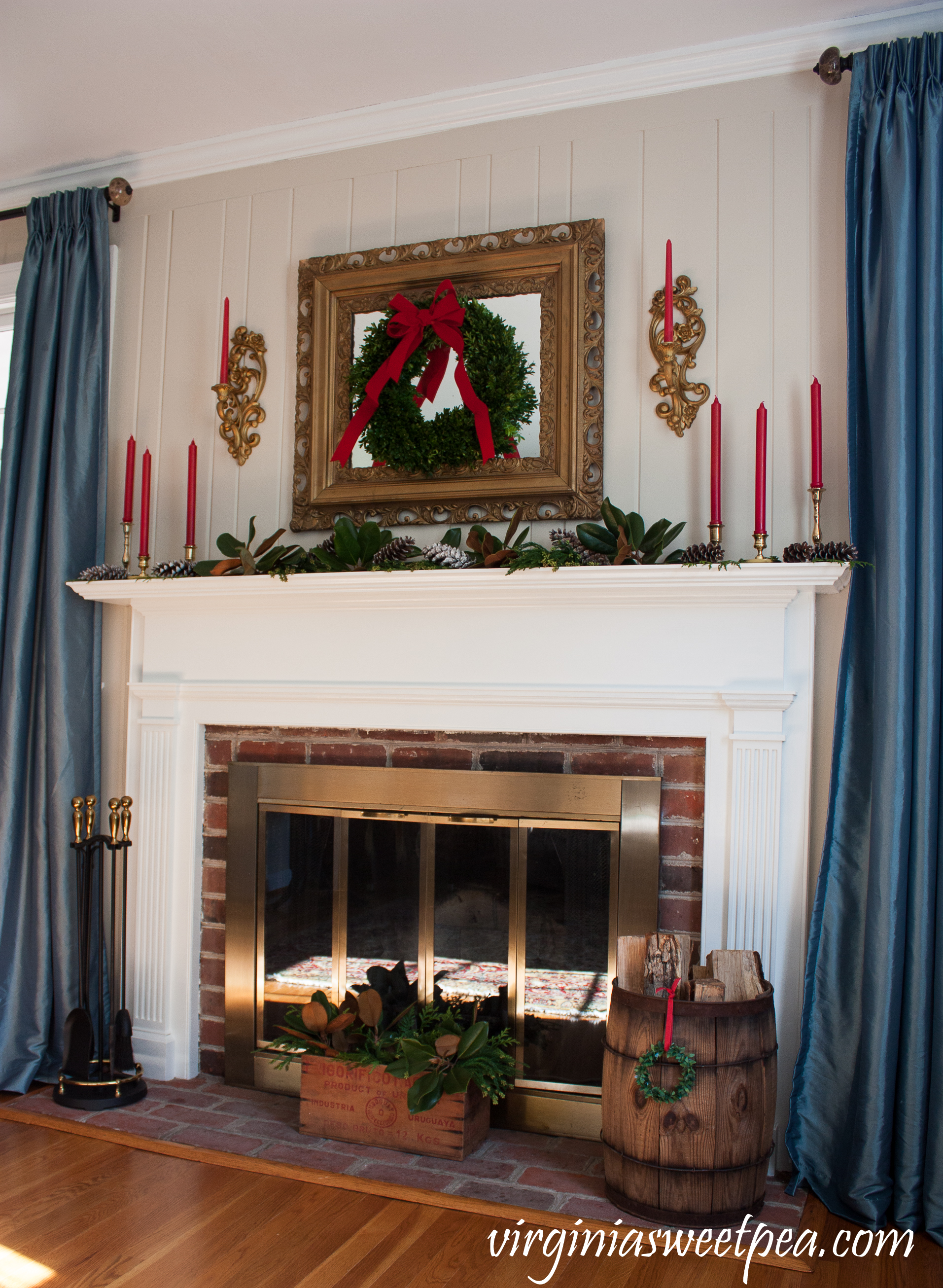 My decor style is traditional and I love to incorporate antiques and vintage into my seasonal decor. Red candles in brass holders look festive combined with greenery and snow-kissed pinecones. A boxwood wreath on the mirror and greenery and firewood on the hearth completes the Christmas mantel.