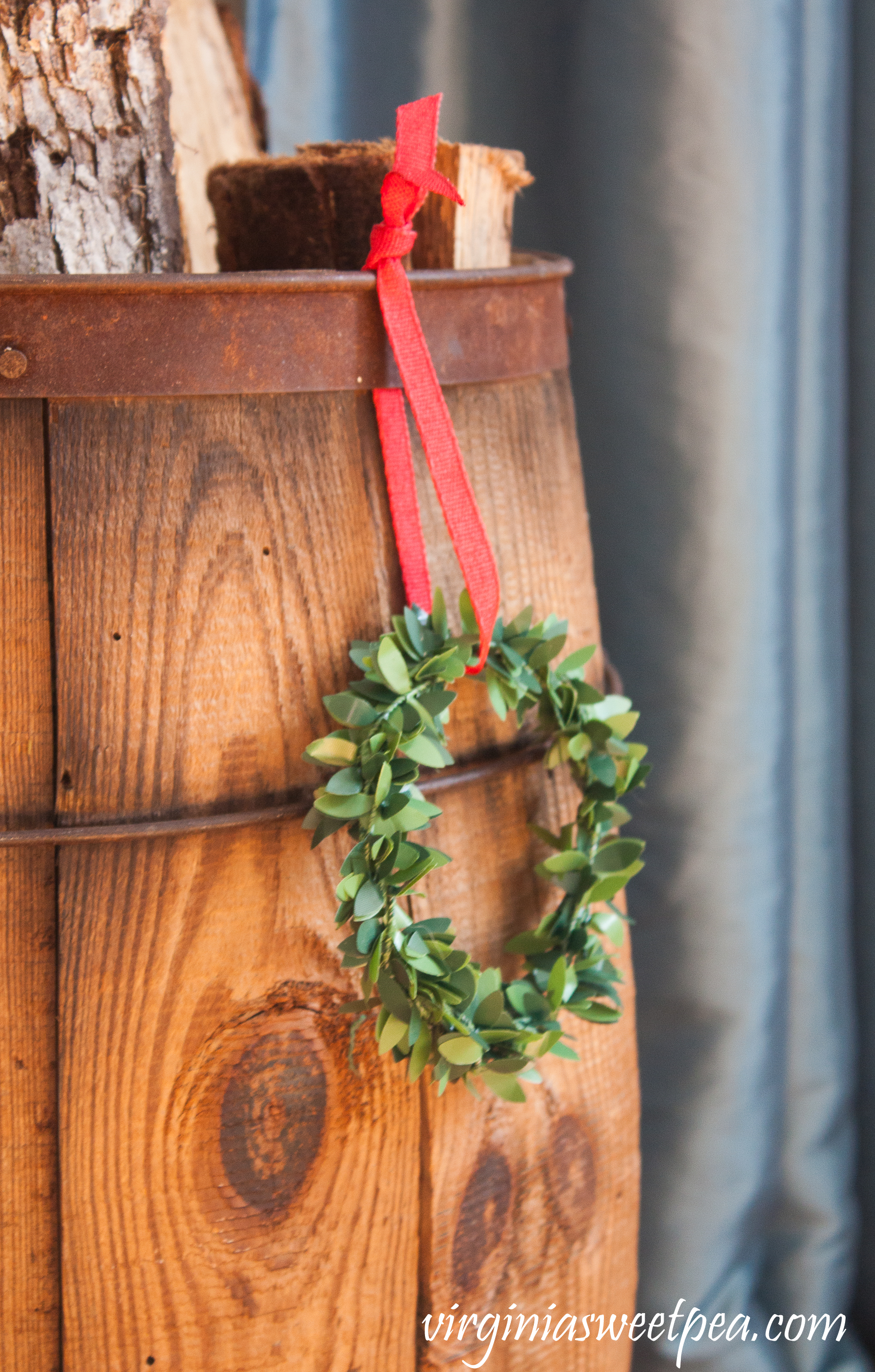 My mom gave me this barrel and I love how it looks embellished with a faux boxwood wreath for Christmas. I made this wreath with faux boxwood garland from Target’s dollar spot.