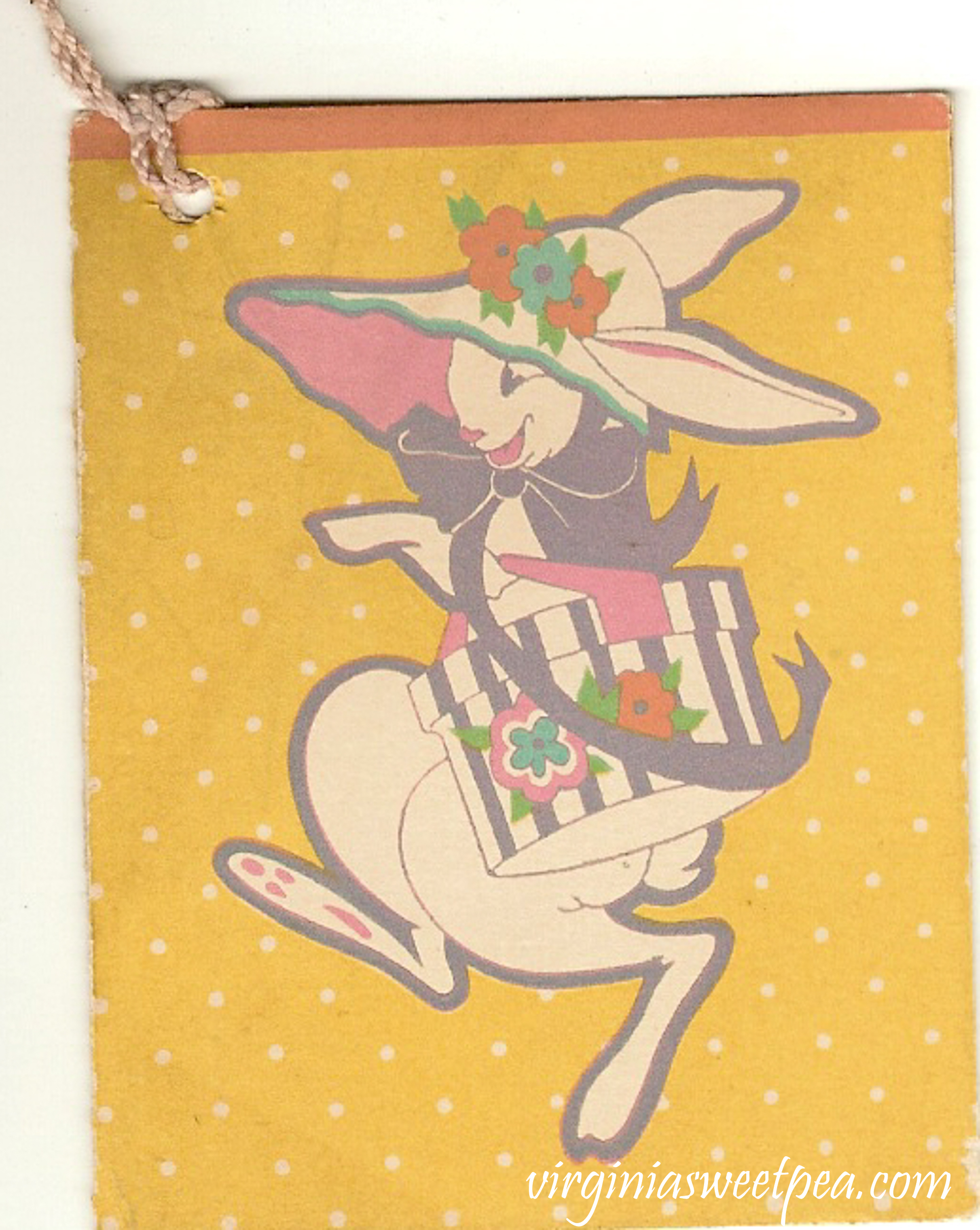 Isn’t it funny how the Easter Bunny has changed in appearance over the years?  This one is all decked out with a bonnet, cape and hat box.