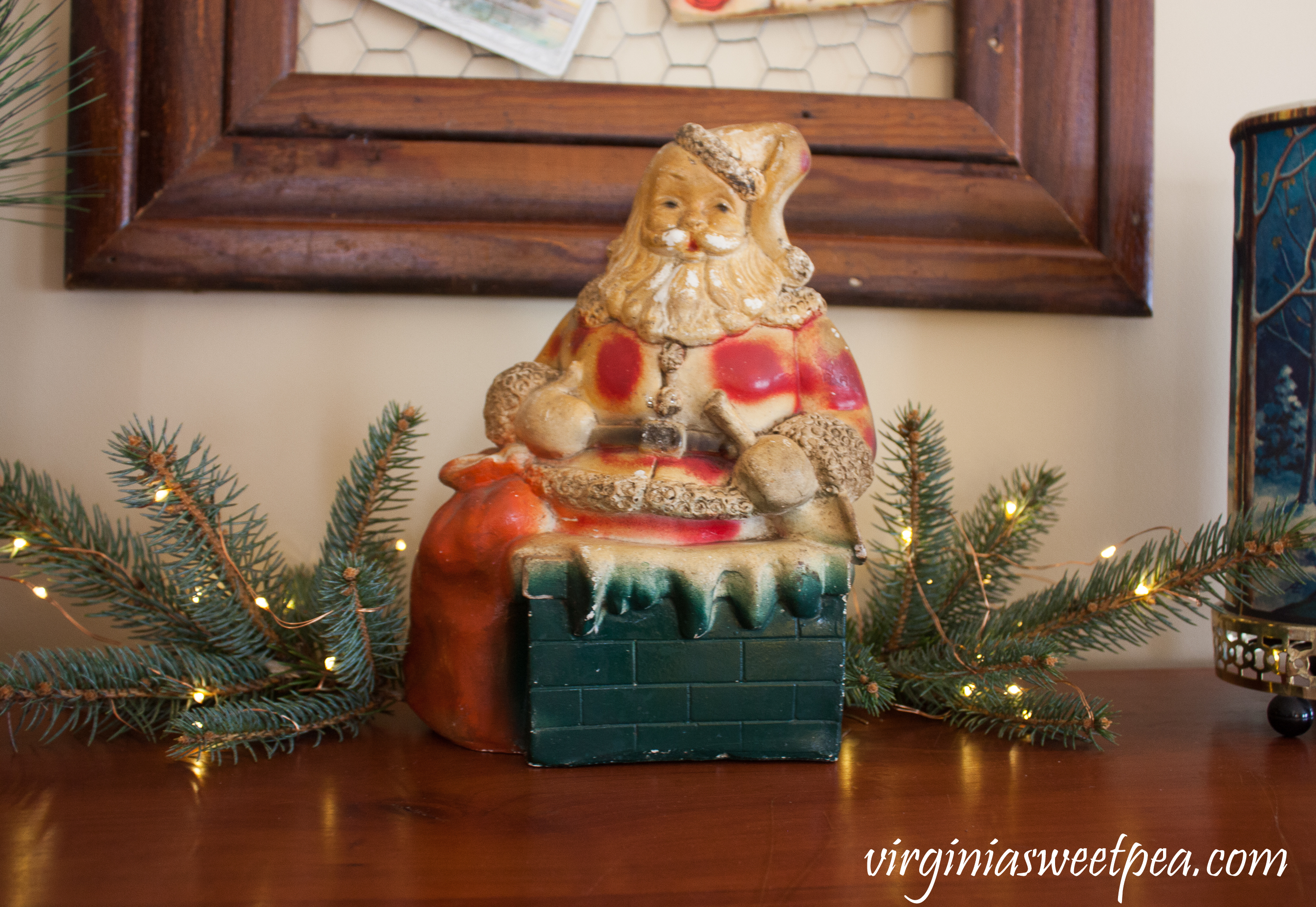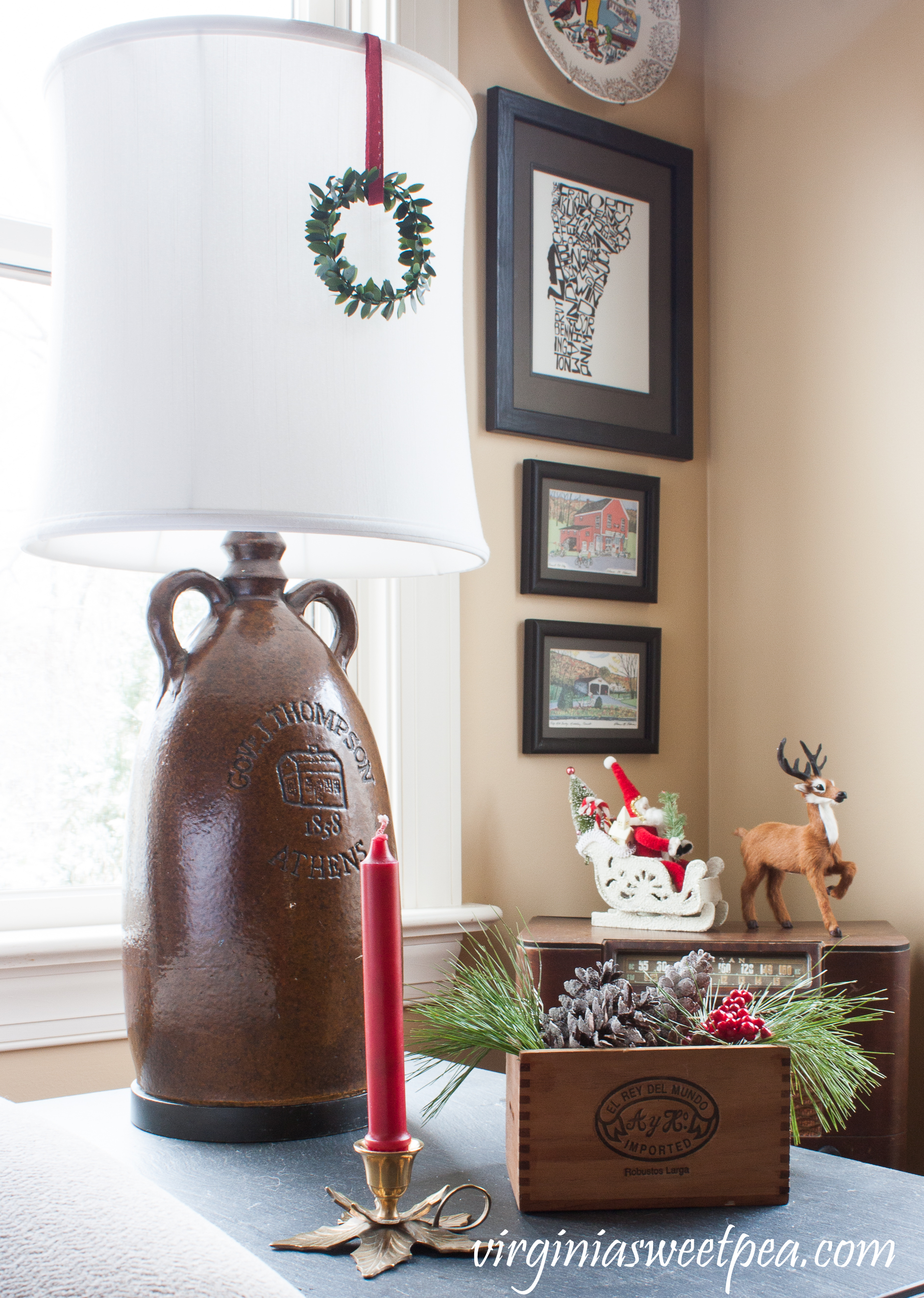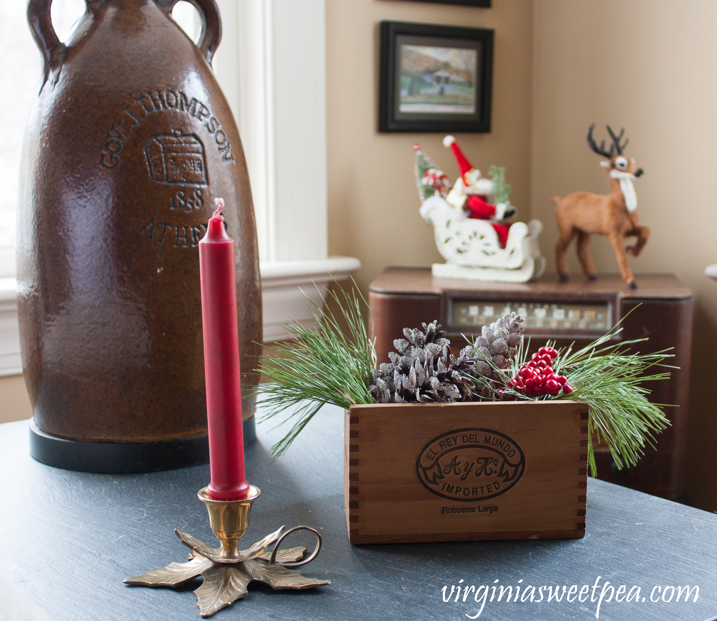 I found the brass holly candlestick holder at Goodwill. The wooden cigar box was picked from a trash pile. (I can’t help myself…) Santa was purchased at The Vermont Country Store on one of our vacations.