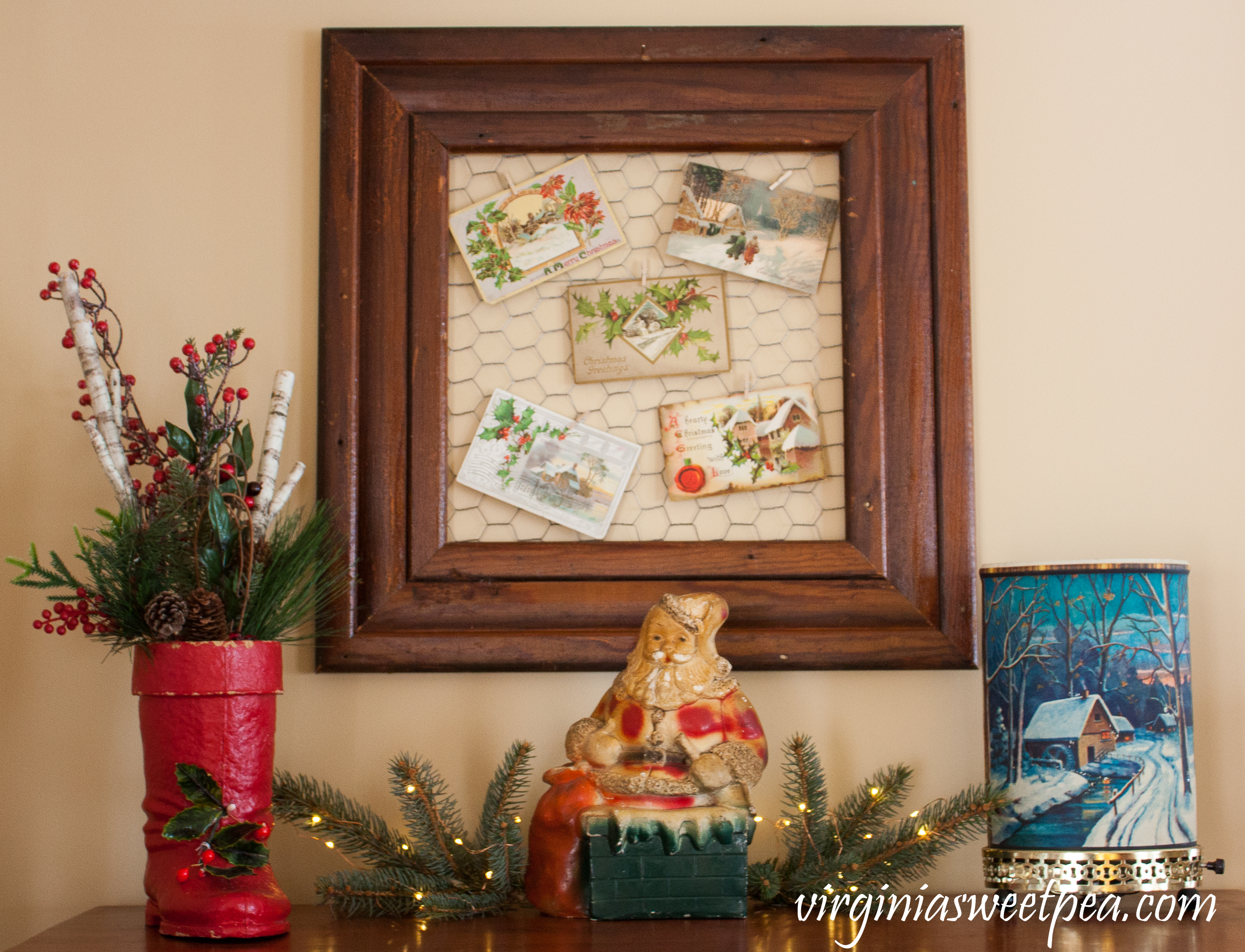 The pie safe top makes a great spot for seasonal decor. I found the large vintage santa boot in an antique shop in Staunton. The Santa in the middle of the display is a bank. The lamp is an Econolite from the 1950’s and it turns and looks like its snowing when it’s on. The frame hanging over the pie safe was made from wood from the school my grandfather attended as a child. On it are vintage postcards from the early 1900’s that belonged to family members.