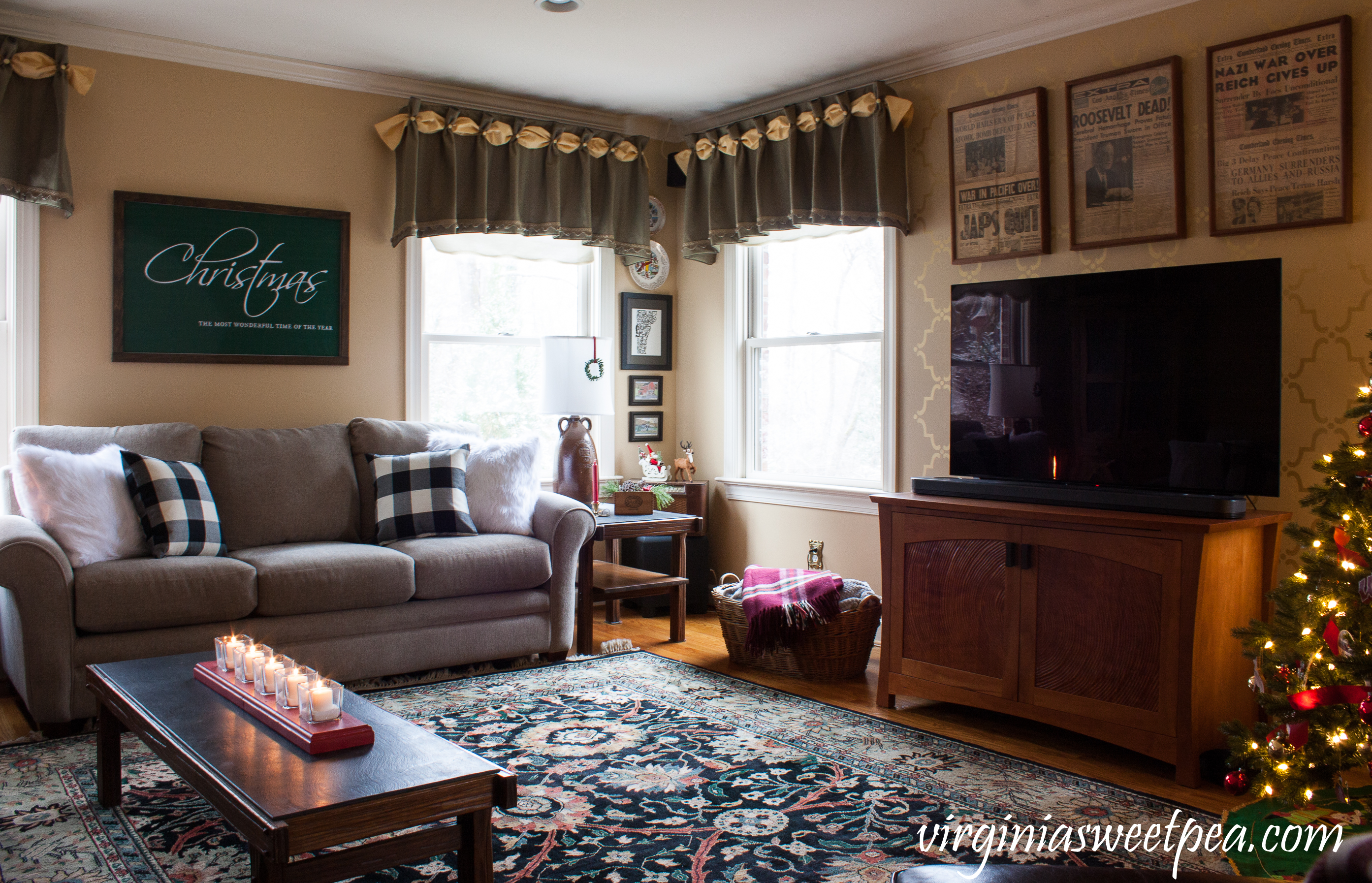 The framed newspapers hanging over our tv are from 1945. I found them at an estate sale this fall and couldn’t resist buying them. The basket to the left of the tv console came from my grandfather’s family farm in Maryland. The throw on top of the basket is a wool stadium blanket that also belonged to my grandfather.