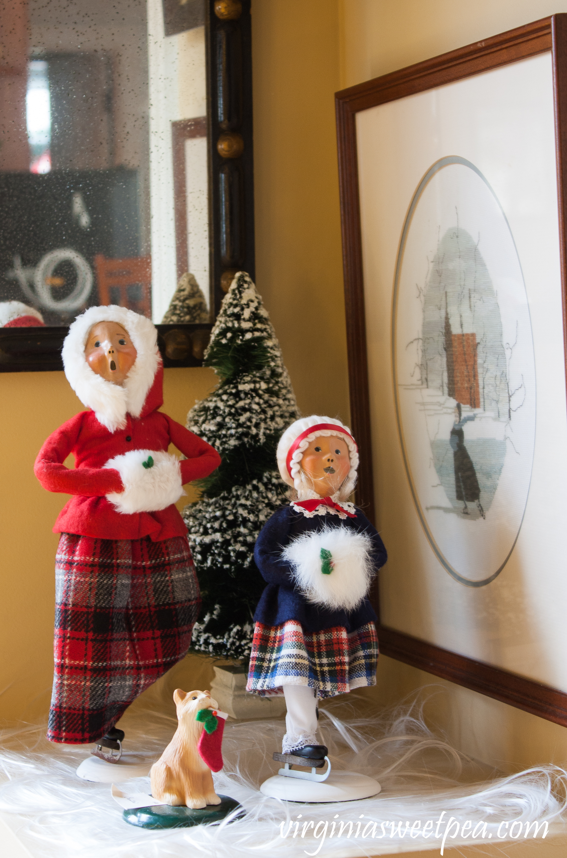 Hanging in the corner behind the Christmas tree is a collection of vintage winter art. I completed the P. Buckley Moss skating scene cross stitch back in 1989 when cross stitch was the rage. Byer’s skaters are skating on an angel hair pond.